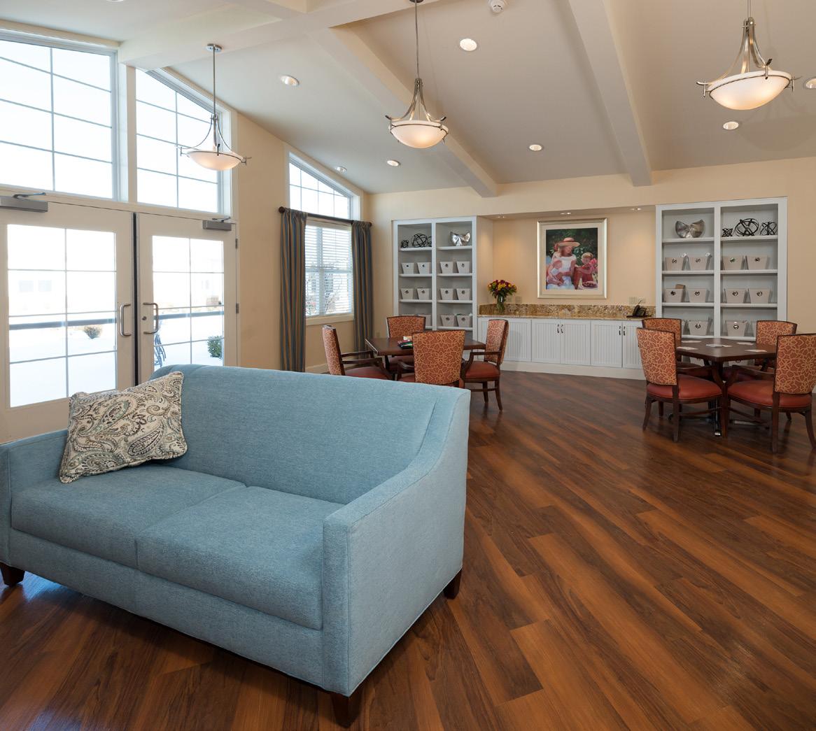 A key component of this community is the arranging of the floors into “neighborhood” spaces. This design allows for small staff and living zones, to ensure quality care and resident comfort. Integrated into the “neighborhoods” are open community spaces, which further encourage a welcoming atmosphere. The memory care unit is configured differently to support the specialized needs of the residents. It features a walking flow for circulation, and separate community and dining spaces.