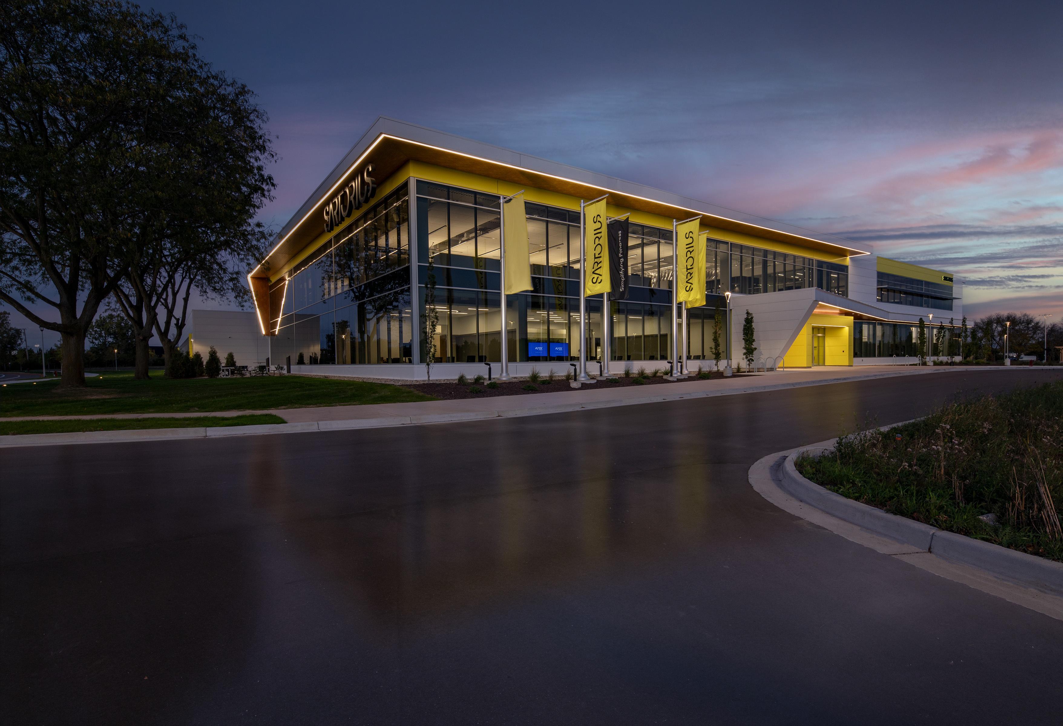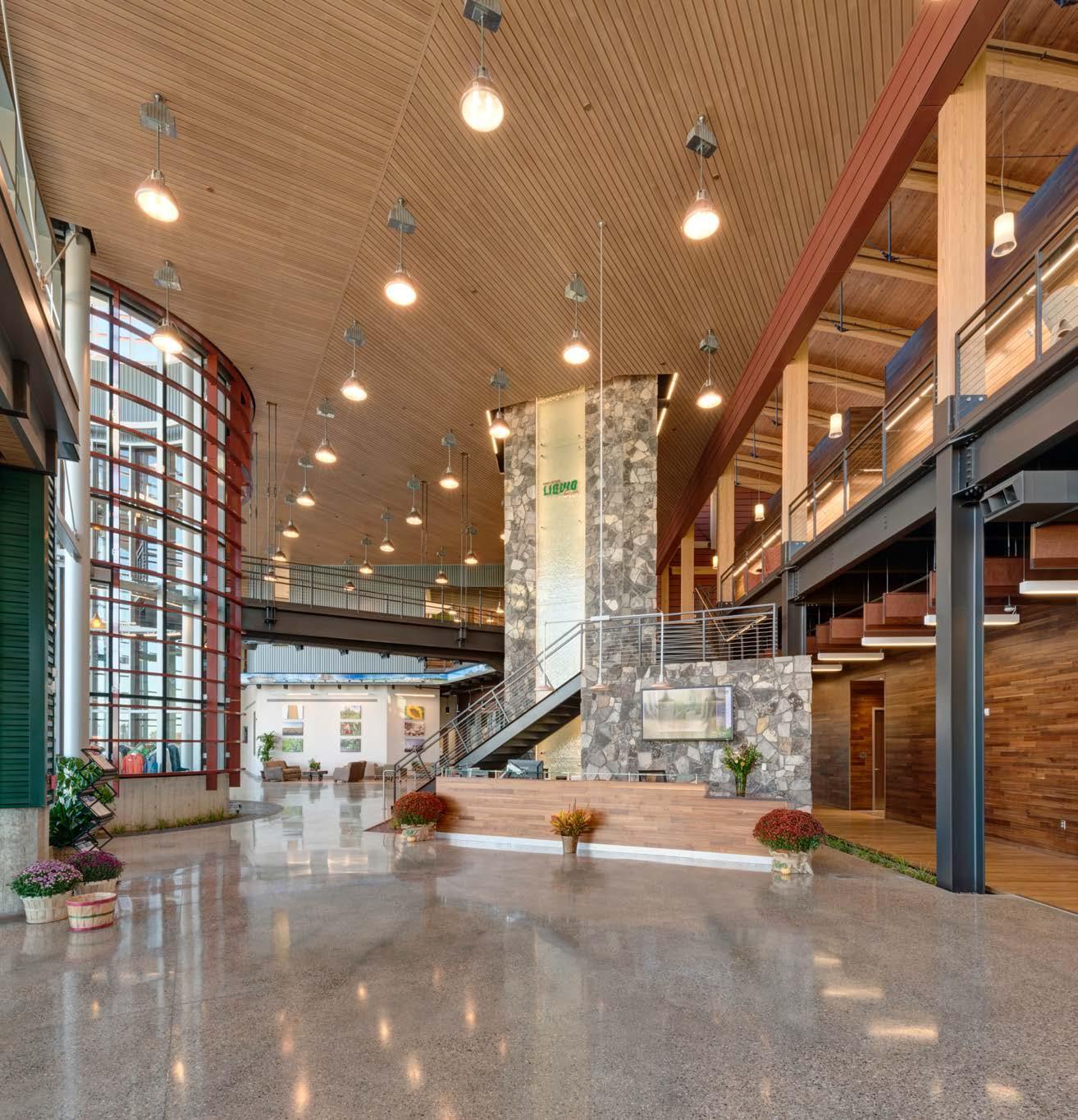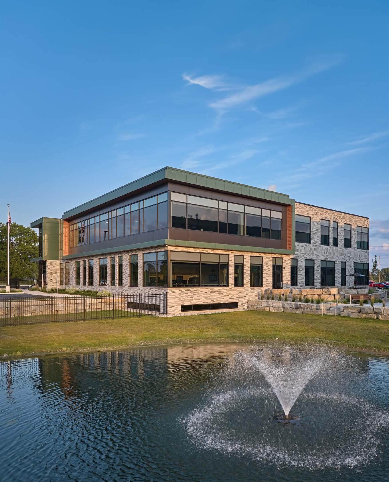 In need of a new corporate headquarters for their operations, Hobbs+Black designed a facility for the company that aesthetically merged the great traditions of farming with the cutting-edge technology that now pervades the agriculture industry. The 50,000-square-foot facility, which includes offices, meeting rooms, a training center, an employee kitchen, a research and development area, and a fitness room, has elements suggesting a classic barn-like structure from one viewpoint, while a modern office with renewable and sustainable elements from another. It has been LEED gold certified.