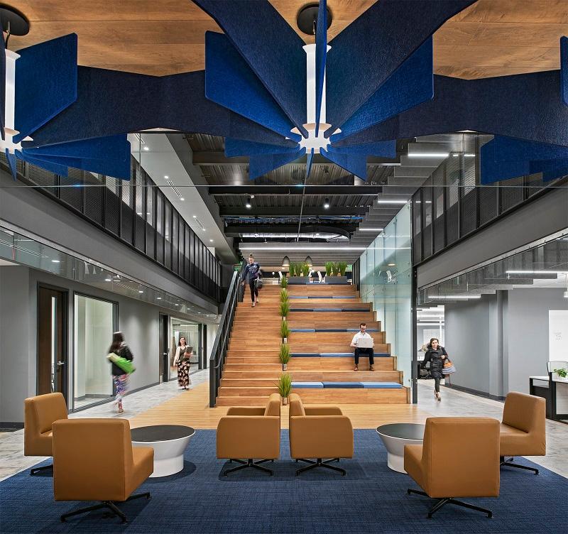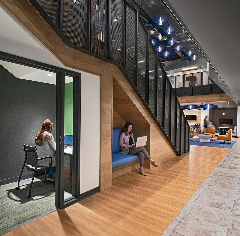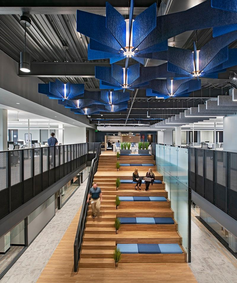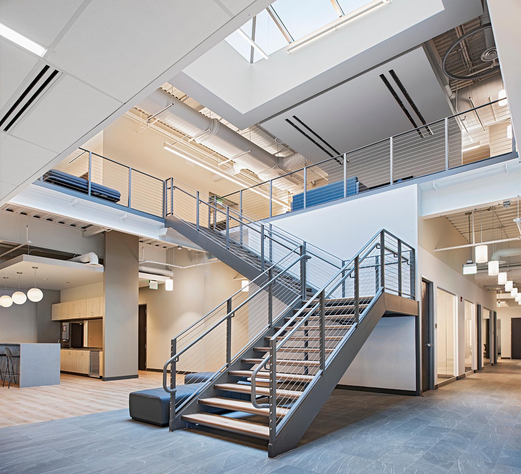 Open office layouts were designed to maximize views of the outdoors, providing every employee access to daylight. Tue most notable of these open spaces, features interconnecting bleacher-style stairs creating a connection between floors with vertical sightlines. This space serves as a flexible individual/small group breakout space as well as a space to host all-staff meeting presentations. Additionally, open meeting spaces located at top and bottom of stairs increases usability