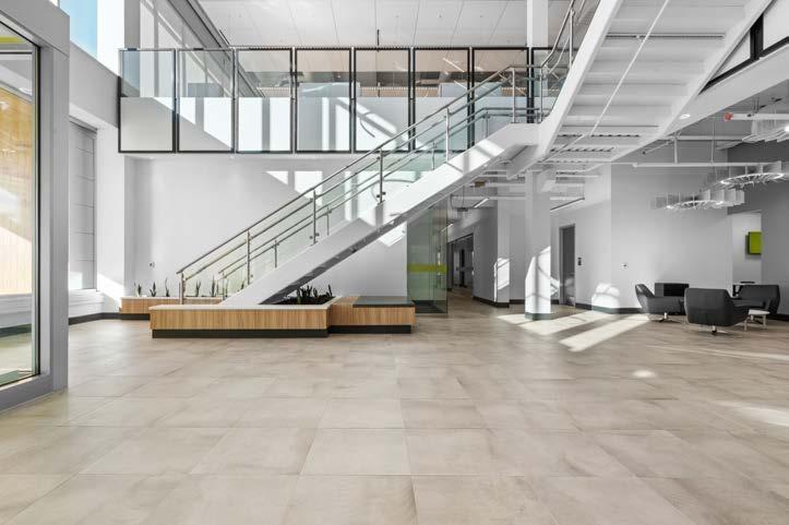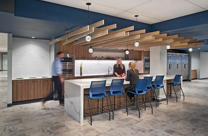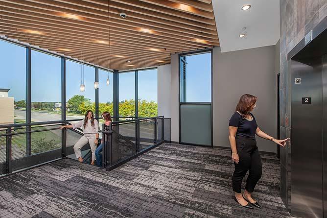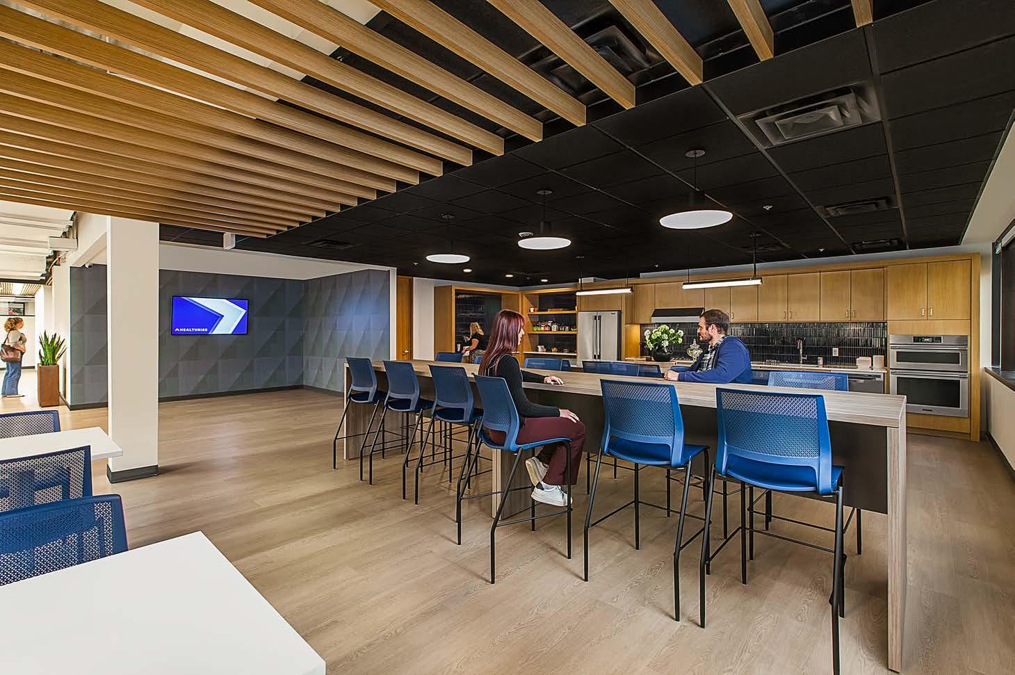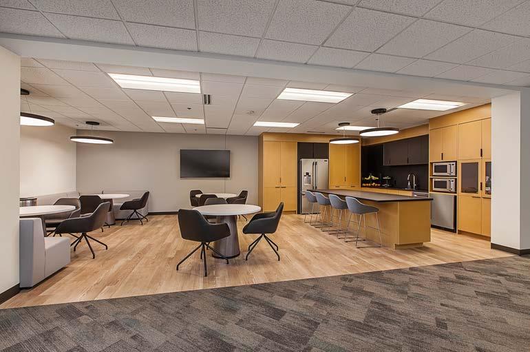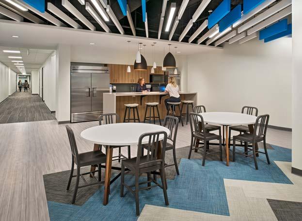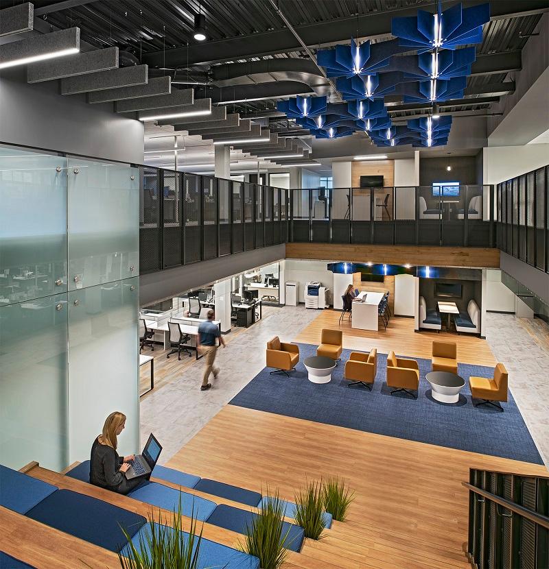 Open office layouts were designed to maximize views of the outdoors, providing every employee access to daylight. Tue most notable of these open spaces, features interconnecting bleacher-style stairs creating a connection between floors with vertical sightlines. This space serves as a flexible individual/small group breakout space as well as a space to host all-staff meeting presentations. Additionally, open meeting spaces located at top and bottom of stairs increases usability