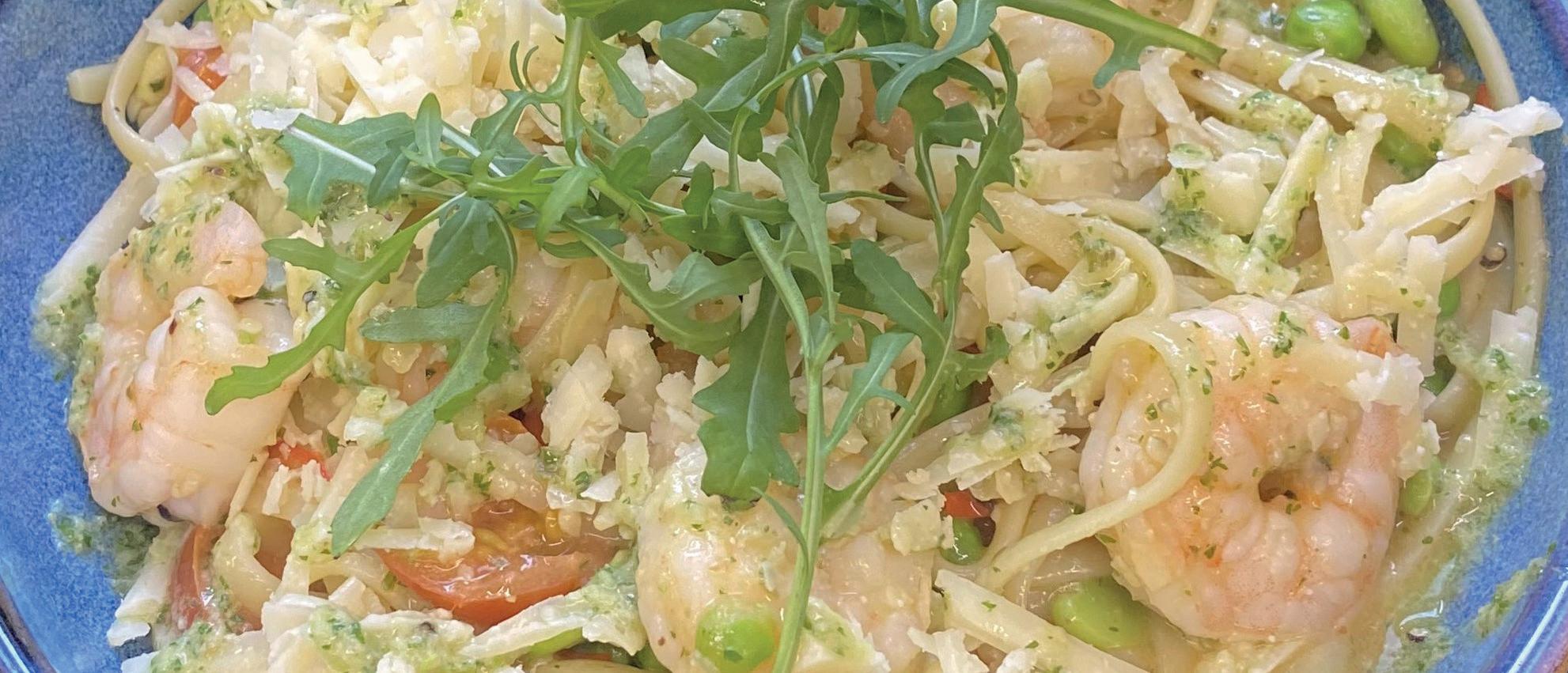 King prawn linguine with cherry tomatoes, broad beans and peas, finished with salsa verde and Winchester cheese.