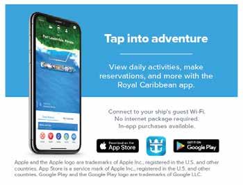 Surf the web, share photos, and send emails for just $28.99 per day. Click on the internet icon in the Royal Caribbean app to begin, or connect to “WiFi-Guest-Anthem” and go to login.com to get started. Internet assistance available.