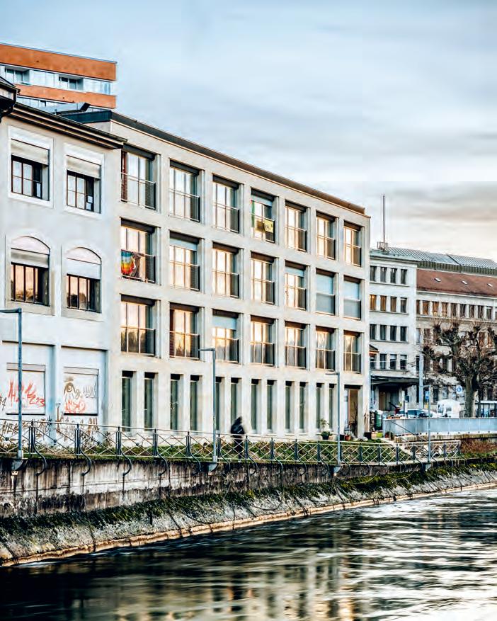 230 Kilometer nördlich von Fontvieille hat die Zukunft schon begonnen. Auf einem Transformationsareal im Süden von Lyon, zwischen Bahnlinie und Rhone, liegt Perraudins bisher grö sste Baustelle. Die 145 Logements c ollectifs umfassen Wohnungen in Eigentum, Erbbaurecht und Sozialmiete sowie G ewerbeeinheiten in einem U-förmigen, bis zu neungeschossigen Gebäude.