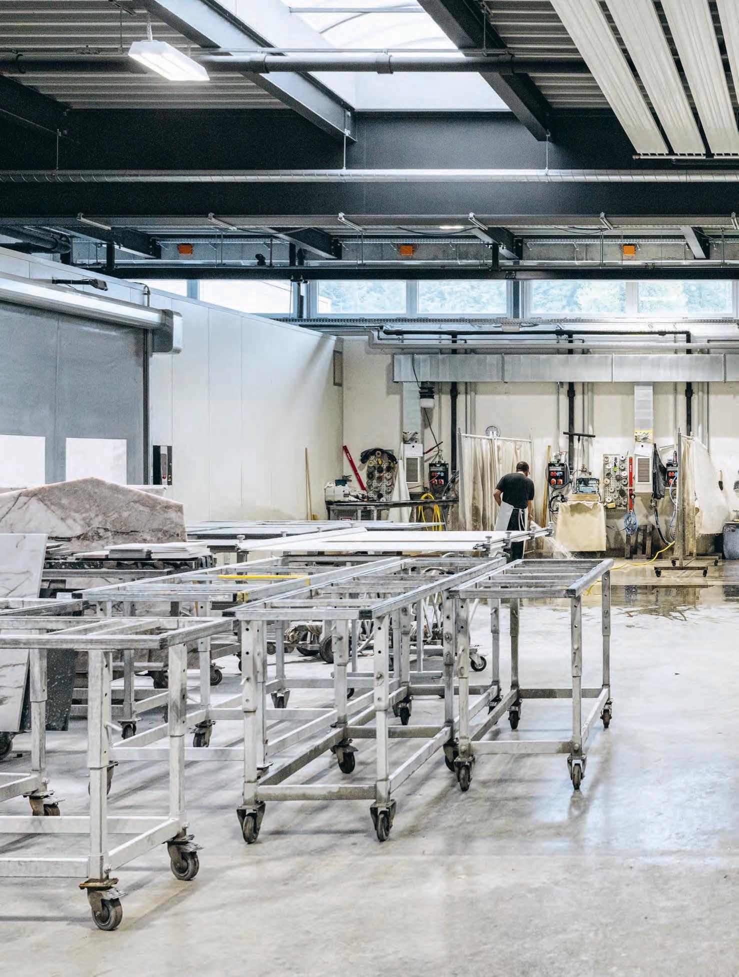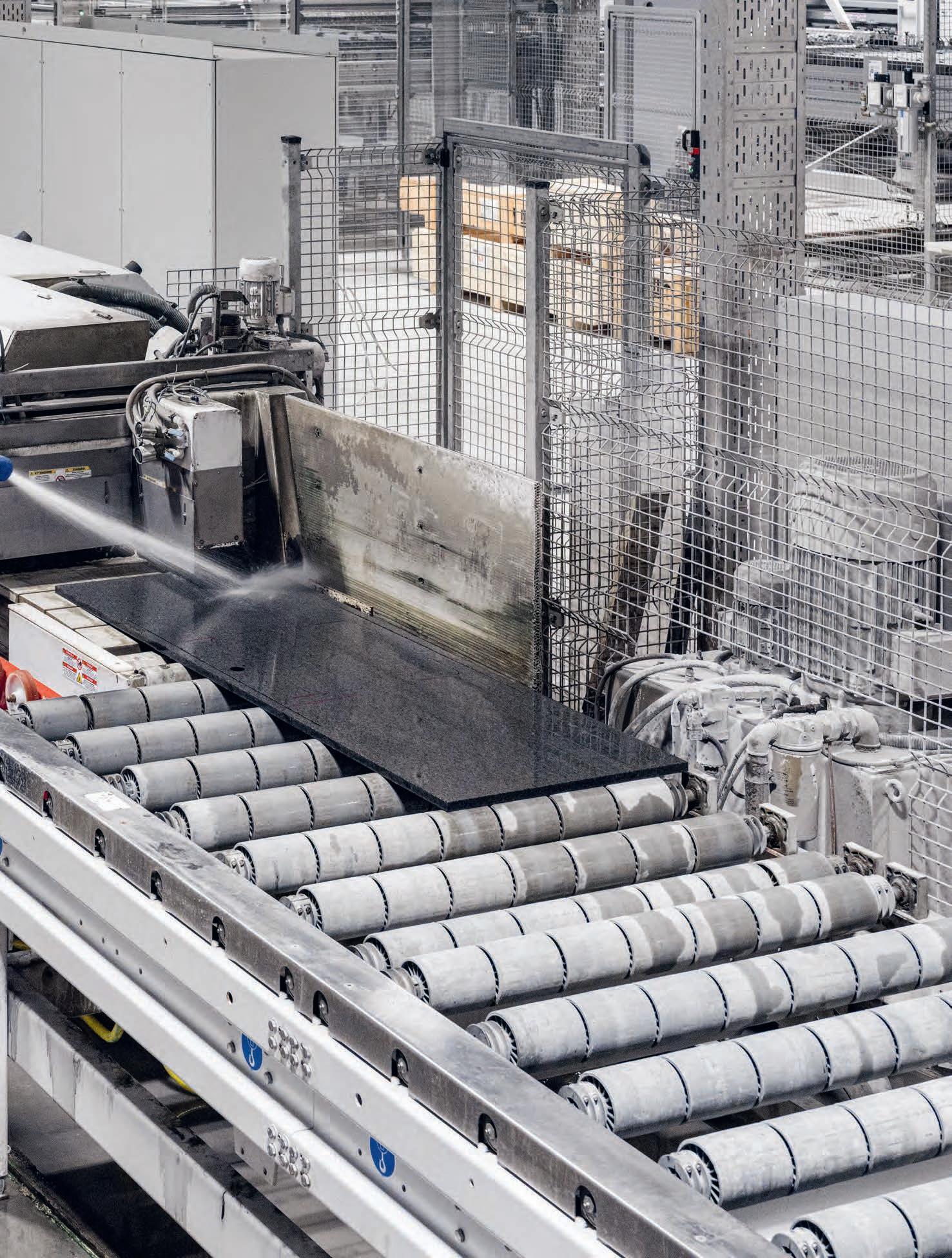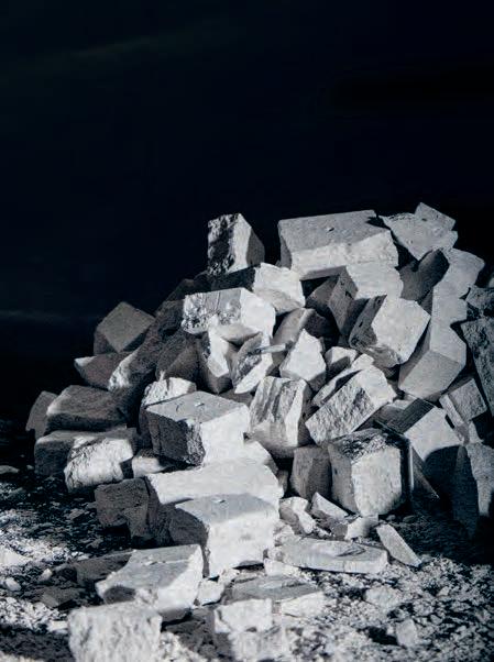 kamen. Heute sägen zwei Per sonen mit Diamantseilen 10 000 Kubikmeter im Jahr aus. Bei uns sind es 3 × 8 Meter grosse Blöcke, je nach Steinschicht 40 bis 150 Zentimeter hoch, also 10 bis 30 Tonnen schwer. Diese werden mit Baggern auf die Seite gezogen und dann zu Rohblöcken von 3 × 1,5 × 1 Meter gespalten, damit sie transportierbar sind und auf die Maschinen passen. Was passiert als Nächstes mit den Rohblöcken ? Zunächst machen wir eine Triage. Zirka 20 Prozent der Rohblöcke haben erstklassige Qualität. Diese kommen in die Steinhauerei und werden mit Seilsägen zu dünnen Platten für Fassaden, Küchen und Böden gesägt sowie mit Kreissägen und CNC Fräsen zu Massivarbeiten wie Brunnen oder Fenstergewände und Gesimse für Denkmäler. 60 Prozent der Rohblöcke haben zweitklassige Qualität. Daraus machen wir in der Spalterei einfache Produkte für den Gartenbau, vor allem gespaltene Mauer und Verbauungssteine sowie dicke Bodenplatten für den Aussenraum. Hier nutzen wir die natürlichen Schwachstellen des Steins. Schweizweit ist die Verteilung relativ ähnlich: 20 bis 40 Prozent werden zu Fertigprodukten für Fassaden und Innenausbau. 30 bis 50 Prozent finden Verwendung im Garten und Landschaftsbau, der Rest als Schotter oder S chüttungen für Rekultivierungsflächen. Das heisst, im Steinbruch gibt es wenig Ausschussware ? Viele Betriebe im Ausland nutzen nur die Filets, die Kutteln schmeissen sie weg. In der Schweiz hätten viele Betriebe damit ein Platzproblem, darum arbeiten die meisten eher ‹ nos e to tail ›. Falls ein Steinbruch nicht zu viele Risse quer zu den Schichten hat, kommen tatsächlich fast 100 Prozent als Blöcke aus dem Berg. Im Spaltwerk gehen 7 bis 8 Prozent des Volumens verloren. Manche Betriebe wie wir verkaufen dieses günstig als Schüttungen, für den Deichbau oder für Hinterfüllungen von Trockenmauern. In der Steinhauerei sind die Verluste grösser. Hier muss man die Rohblöcke auf allen Seiten sauber mit der Kreissäge zu geometrischen Blöcken schneiden. Danach sind die Verluste bei Bodenplatten oder Fensterbänken minimal, bei dreidimensionalen Arbeiten wie Brunnen oder Lavabos dagegen gross. Insgesamt entstehen in etwa 20 Prozent Produktionsreste. Diese baut man zur Rekultivierung im Steinbruch wieder ein.