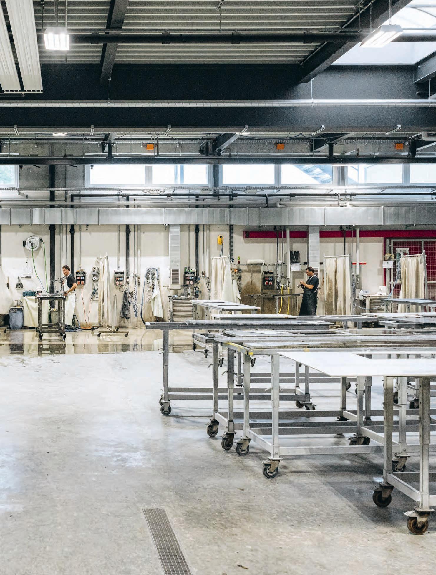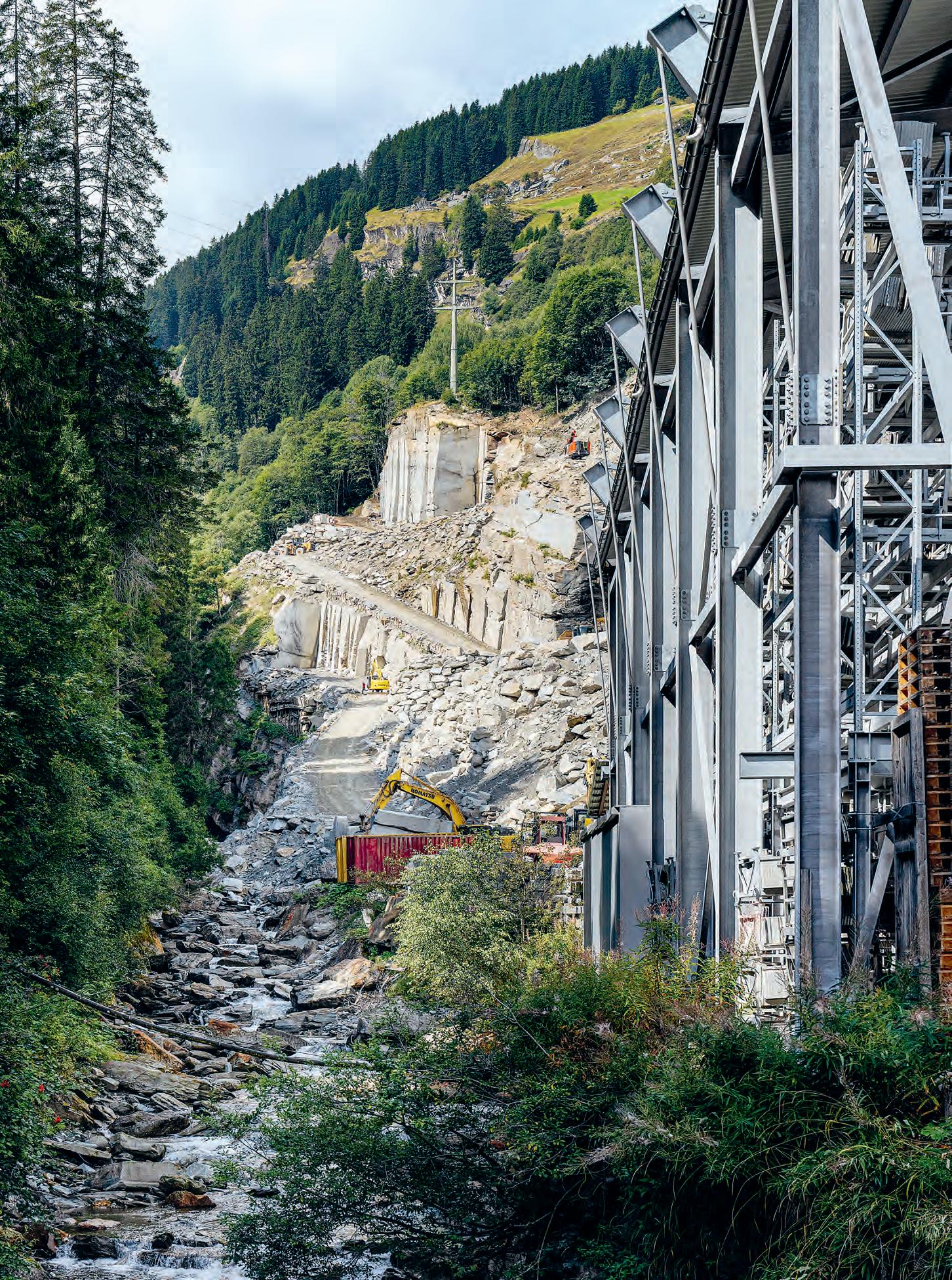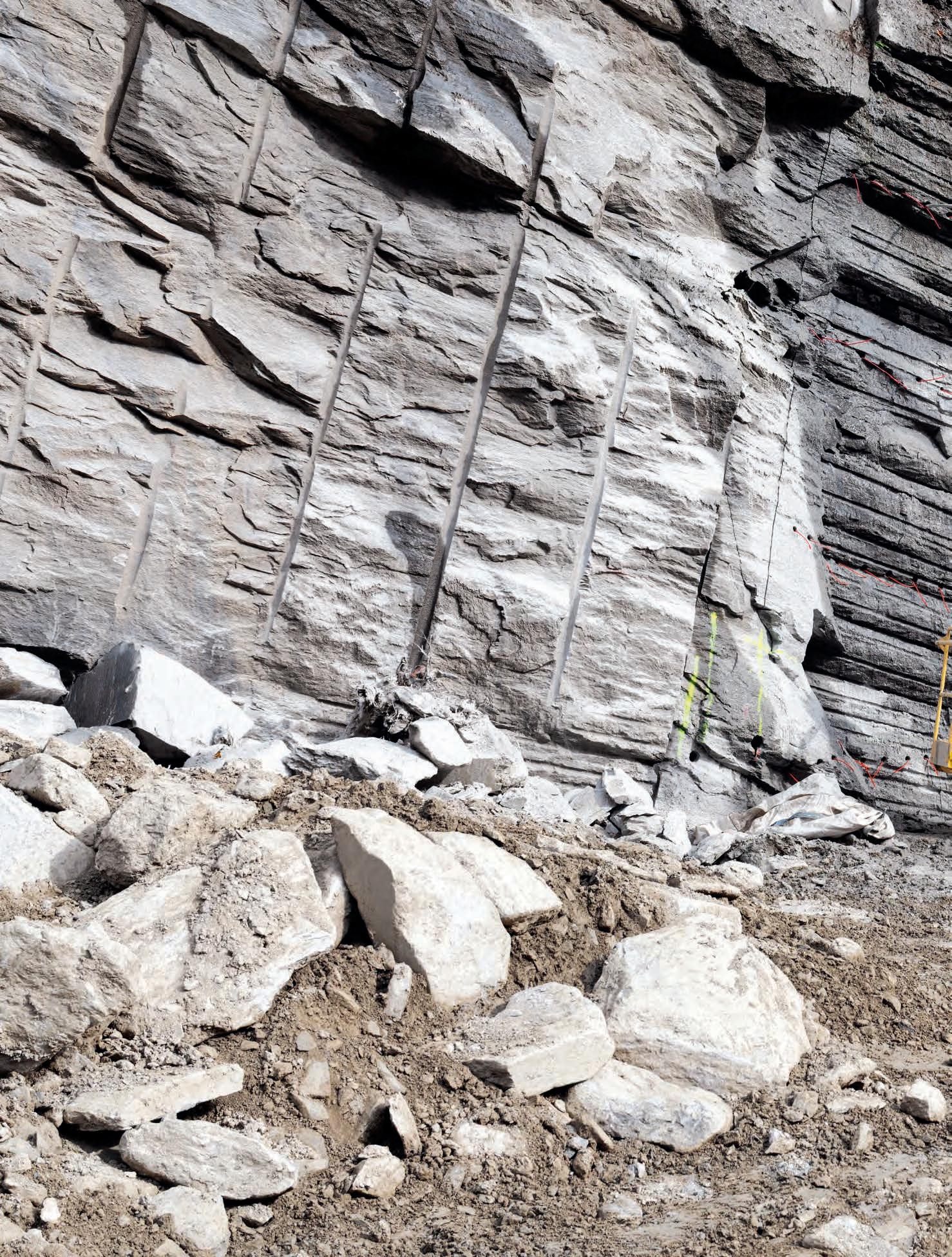 kamen. Heute sägen zwei Per sonen mit Diamantseilen 10 000 Kubikmeter im Jahr aus. Bei uns sind es 3 × 8 Meter grosse Blöcke, je nach Steinschicht 40 bis 150 Zentimeter hoch, also 10 bis 30 Tonnen schwer. Diese werden mit Baggern auf die Seite gezogen und dann zu Rohblöcken von 3 × 1,5 × 1 Meter gespalten, damit sie transportierbar sind und auf die Maschinen passen. Was passiert als Nächstes mit den Rohblöcken ? Zunächst machen wir eine Triage. Zirka 20 Prozent der Rohblöcke haben erstklassige Qualität. Diese kommen in die Steinhauerei und werden mit Seilsägen zu dünnen Platten für Fassaden, Küchen und Böden gesägt sowie mit Kreissägen und CNC Fräsen zu Massivarbeiten wie Brunnen oder Fenstergewände und Gesimse für Denkmäler. 60 Prozent der Rohblöcke haben zweitklassige Qualität. Daraus machen wir in der Spalterei einfache Produkte für den Gartenbau, vor allem gespaltene Mauer und Verbauungssteine sowie dicke Bodenplatten für den Aussenraum. Hier nutzen wir die natürlichen Schwachstellen des Steins. Schweizweit ist die Verteilung relativ ähnlich: 20 bis 40 Prozent werden zu Fertigprodukten für Fassaden und Innenausbau. 30 bis 50 Prozent finden Verwendung im Garten und Landschaftsbau, der Rest als Schotter oder S chüttungen für Rekultivierungsflächen. Das heisst, im Steinbruch gibt es wenig Ausschussware ? Viele Betriebe im Ausland nutzen nur die Filets, die Kutteln schmeissen sie weg. In der Schweiz hätten viele Betriebe damit ein Platzproblem, darum arbeiten die meisten eher ‹ nos e to tail ›. Falls ein Steinbruch nicht zu viele Risse quer zu den Schichten hat, kommen tatsächlich fast 100 Prozent als Blöcke aus dem Berg. Im Spaltwerk gehen 7 bis 8 Prozent des Volumens verloren. Manche Betriebe wie wir verkaufen dieses günstig als Schüttungen, für den Deichbau oder für Hinterfüllungen von Trockenmauern. In der Steinhauerei sind die Verluste grösser. Hier muss man die Rohblöcke auf allen Seiten sauber mit der Kreissäge zu geometrischen Blöcken schneiden. Danach sind die Verluste bei Bodenplatten oder Fensterbänken minimal, bei dreidimensionalen Arbeiten wie Brunnen oder Lavabos dagegen gross. Insgesamt entstehen in etwa 20 Prozent Produktionsreste. Diese baut man zur Rekultivierung im Steinbruch wieder ein.