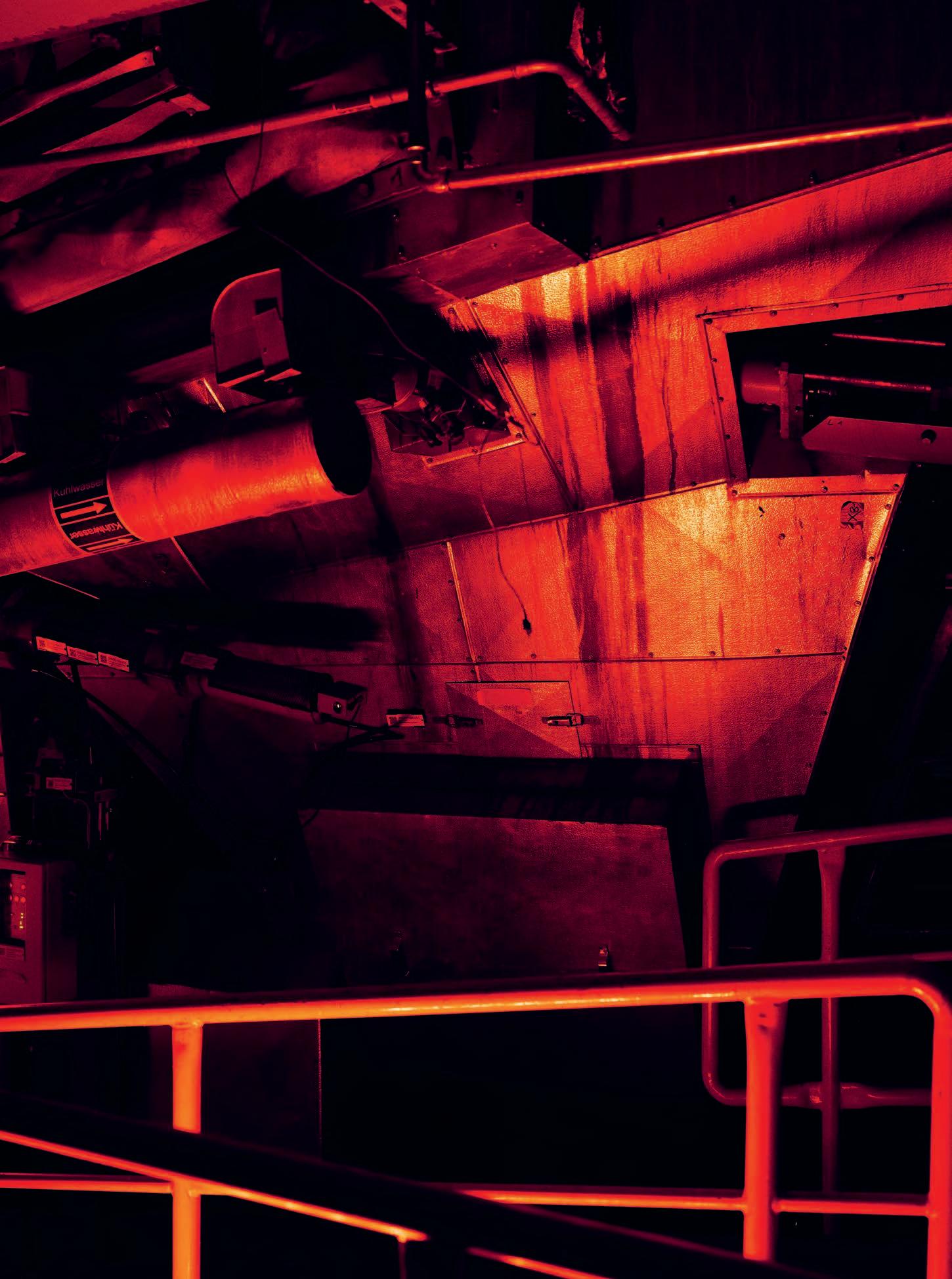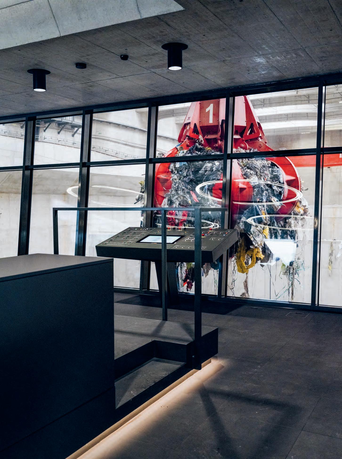 Besuchende der Energiezentrale Forsthaus gelangen über eine elegante Treppe ins Innere. Danach führt ein « Promenadendeck » lateral üb er die gesamte Länge des Baus und gibt gezielte Einblicke in den Abfallverwertungsund Energieerzeugungsprozess. Ein spektakulärer Blick in den Kehrichtbunker am Ende des Gangs rundet den Besuch ab. Kein Zufall also, dass das Forsthaus bald schon als Publikumsmagnet galt.