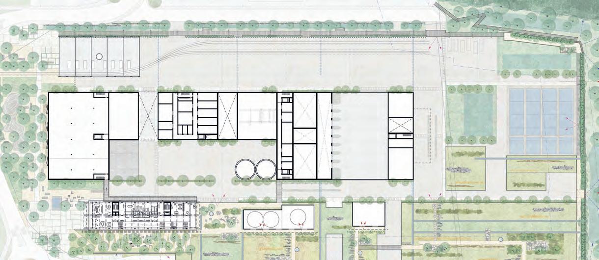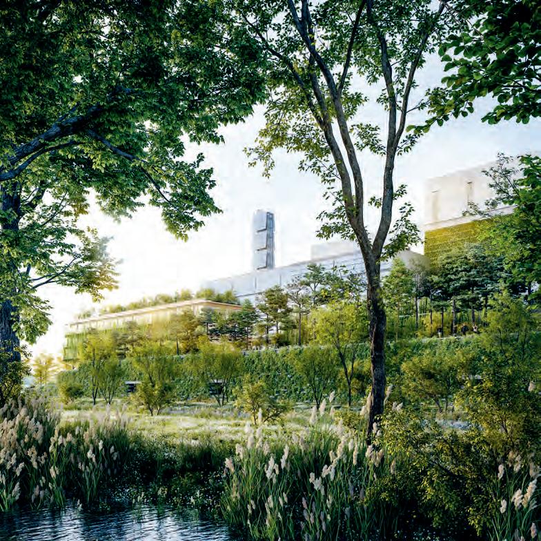 zum bestehenden Bauwerk von Antoniol + Huber darstellt: Statt auf Monumentalität setzt ihr Entwurf auf Verschmelzung oder sogar Auflösung in der Landschaft. Eine horizontale Gliederung teilt die grosse Baumasse in drei Schichten. Den untersten Teil bildet ein massiver Sockel aus Recyclingbeton, der auf den mineralischen, künstlich geformten Boden in der Umgebung Bezug nimmt. Darauf folgt eine durchlässige, mit Rankpflanzen begrünte Schicht, die den Baukörper optisch mit der Vegetation der Umgebung verbindet. Die Bauvolumen im obersten Drittel wiederum sind mit einer leicht gefalteten, gläsernen Hülle aus Photovoltaikmodulen verkleidet. In ihnen spiegelt sich der Himmel, sodass sich die KVA optisch aufzulösen beginnt. Ein gleichermassen vorsichtiger und experimentierfreudiger Umgang mit der landschaftlichen Situation. Typisch für die neue Generation von Kehrichtverwertungsanlagen ist der additive Charakter und modulare Aufbau der Anlage. Durch die gewählte Skelettbauweise bleibt das Bauwerk flexibel und kann ohne grosse Eingriffe erweitert oder modifiziert werden. Die kompakte Platzierung des Baus im südlichen Teil des Areals schafft zudem Raumreserven zwischen neuer und alter KVA. Bereits mitgedacht im Entwurf ist nämlich die « zweite Zukunft » der KVA Thurgau: 2070, wenn dereinst auch die neue Anlage ihren Lebenshorizont erreicht haben wird, soll dort, wo heute die Kehrichtkathedrale von Antoniol + Huber platziert ist, die übernächste KVA bereitstehen. Bauten für zukünftige Komponenten wie die CO₂-Abscheidung finden Platz dazwischen und können sowohl mit der nächsten als auch mit der übernächsten Anlage interagieren.