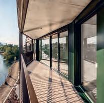 Die Fenster in Eiche harmonieren mit den Eichendielen, und die Metallelemente, die sichtbar bleiben, sind farblich abgestimmt. Die Profile sind im passenden Farbton beschichtet, die Messinggriffe brüniert. Die Rosetten, von Huber Fenster exklusiv für dieses Projekt entwi ckelt, sind in das Flügelprofil eingelassen und haben ein sehr kleines Griffschild. So wirken sie elegant und hochwertig. «Die hohen Ansprüche der Bauträger haben wir mit vielen filigranen Arbeiten umgesetzt. Hinter der schlichten Eleganz steckt unser bestes Handwerk», so Matthias Huber.