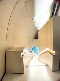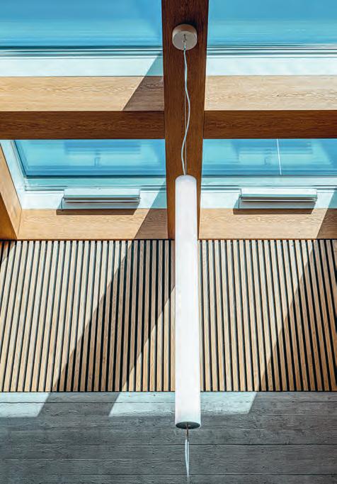 flutet das Entree und die breite zweiläufige Treppenanlage mit natürlichem Licht. Durch das Raster seiner Unterzüge gelenkt, inszeniert es auf Betonwänden und Eichenholzböden ein je nach Tages- und Jahreszeit wechselndes Licht- und Schattenspiel. Die 4,2 mal 7,1 Meter grosse Öffnung befindet sich rund eineinhalb Meter über der Decke des obersten Geschosses. Um die Innenwände des Dachaufbaus ziehen sich, einem Kranz ähnlich, Holzlamellen, die für eine gute Raumakustik sorgen.