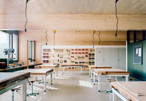 Neben den Bauteilen im Aussenbereich – Fensterelemente der Längsfassaden, Abdeck- und Dachrandbleche sowie Briefkästen – set zten die Architekten Permagreen auch im Innern des Schulhauses ein, etwa an Gitterwänden zwischen Materiallager und Korridoren oder als Abdeckung von Klimakonvektoren und Verbundlüftern. Zusammen mit dem Holz wurde das Material so zu einem verbindenden Element von innen und aussen. «Permagreen verleiht der Schulanlage Wiesental ihre charakteristische Präsenz – technisch präzise umgesetzt durch die enge Zusammenarbeit mit BWB», fasst Daniel Penzis zusammen. 0