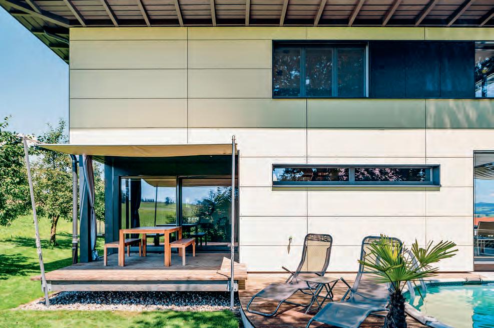 Huber, COO der zuständigen Firma Huber Fenster. Die schlichten Fenster- und Türrahmen lassen kaum vermuten, dass sich darin viel Technik verbirgt. Matthias Huber erklärt: «Die Einfachheit der Fenster täuscht über die Komplexität hinweg: Wir haben alles technisch Notwendige in den Rahmen integriert.» Die Rahmen nehmen nicht nur das dreifache Isolierglas auf, sondern auch die Beschläge, die vollständig verdeckt sind. In allen Fenstern sind Alarmkontakte und Einbruchschutz eingelassen, und in den Badezimmerfenstern wurden die Öffnungsmotoren verdeckt verbaut. In die Rahmen der Schiebetüren wiederum sind Plissees eingearbeitet, die bei Bedarf als Insektenschutz ausziehbar sind.