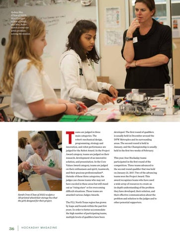 developed. The first round of qualifiers is usually held in December around the DFW Metroplex and its surrounding areas. The second round is held in January, and the Championship is usually held in the first two weeks of February. This year, four Hockaday teams participated in the first round of the competition. Three teams advanced to the second round qualifier that was held on January 21, 2017. Two of the advancing teams won the Project Award. This award recognizes teams who have used a wide array of resources to create an in-depth understanding of the problem they have developed, their solution, and their effective communication about the problem and solution to the judges and to other potential supporters.