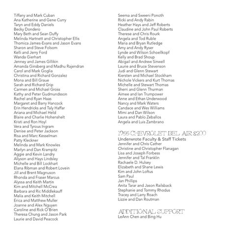 1955 CHEVROLET BEL AIR $200 Underwrote Faculty & Staff Tickets Jennifer and Chris Cather Christine and Christopher Flanagan Lisa and Joseph Forbess Jennifer and Tal Franklin Rachaele D. Hulsey Elizabeth and Shane Lewis Kim and John Loftus Sam Paul Jan Phillips Anita Tarar and Jason Railsback Stephanie and Tommy Rhodus Tracey and Larry Roach Lizzie and Dan Routman