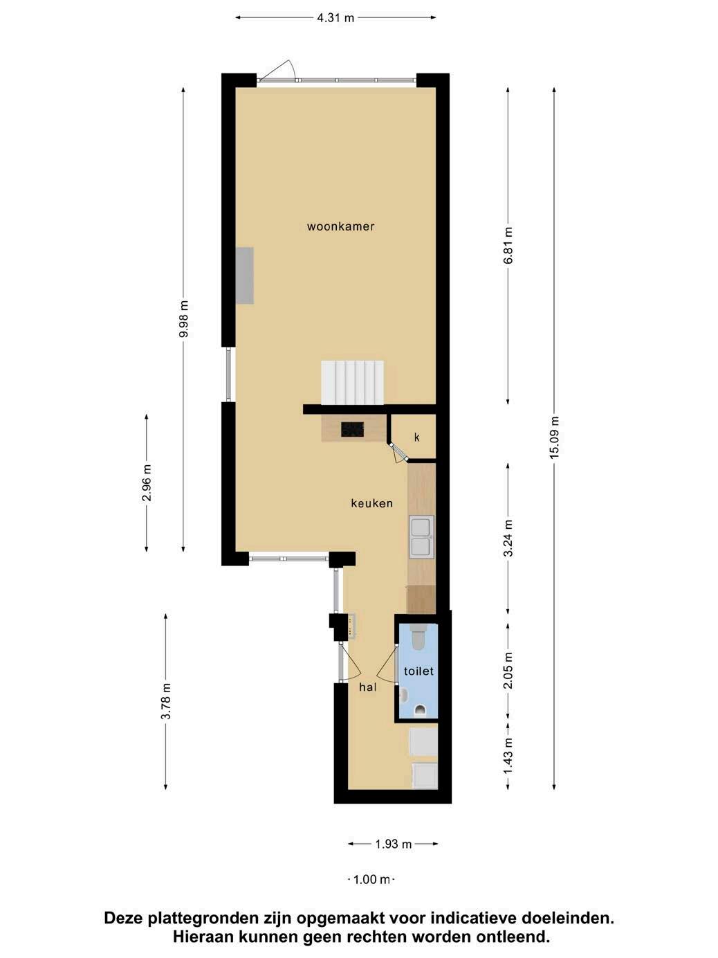 Via de entree aan de voorzijde van het huis kom je de woning binnen in een hal met de opstelling voor het witgoed, het toilet en een open doorgang naar de half open keuken.