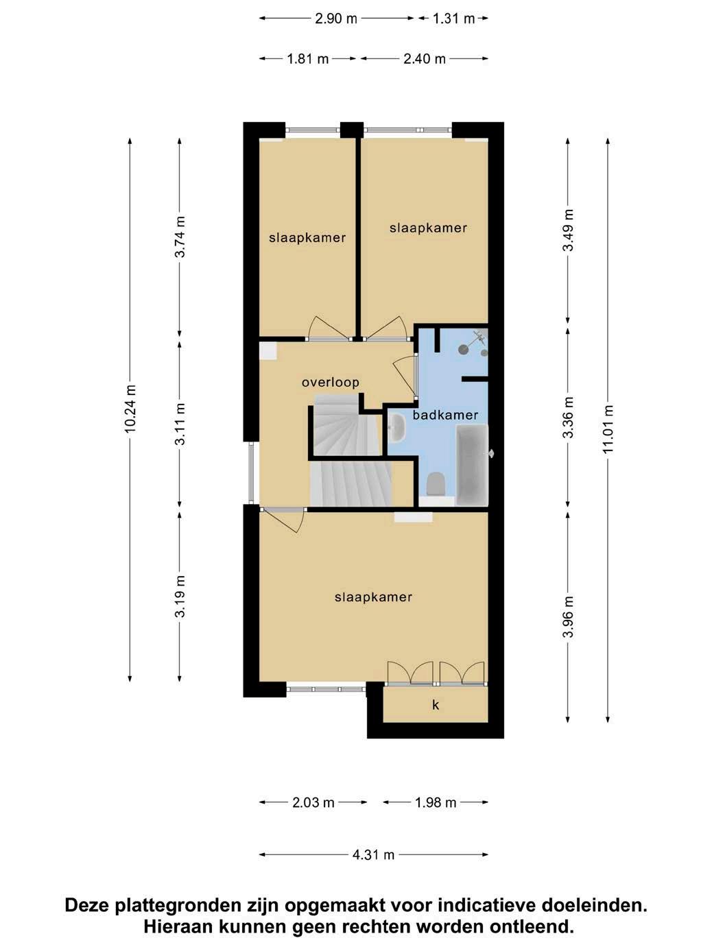 De slaapkamer aan de voorzijde van de eerste verdieping is groot van formaat en deze heeft vaste kasten. De andere twee kamers hebben ook prima afmetingen en alle kamers zijn netjes afgewerkt.