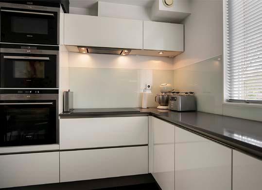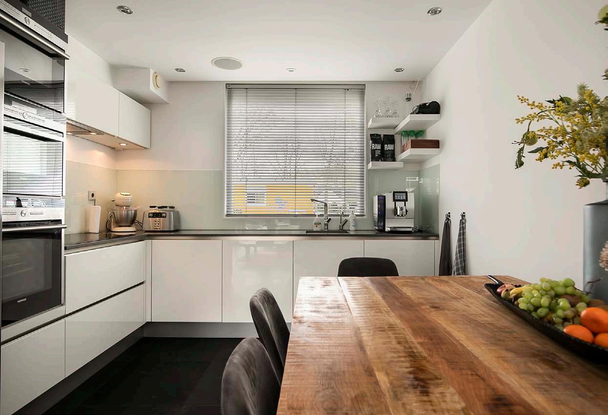 Vanuit de woonkamer lopen we door naar de keuken. Met deze luxe keuken ben je verzekerd van optimaal kookcomfort en een prachtige uitstraling. Dankzij de ruime opstelling is er genoeg plek voor een gezellige eethoek, waar je tijdens het kokkerellen in contact blijft met jouw gasten aan tafel.