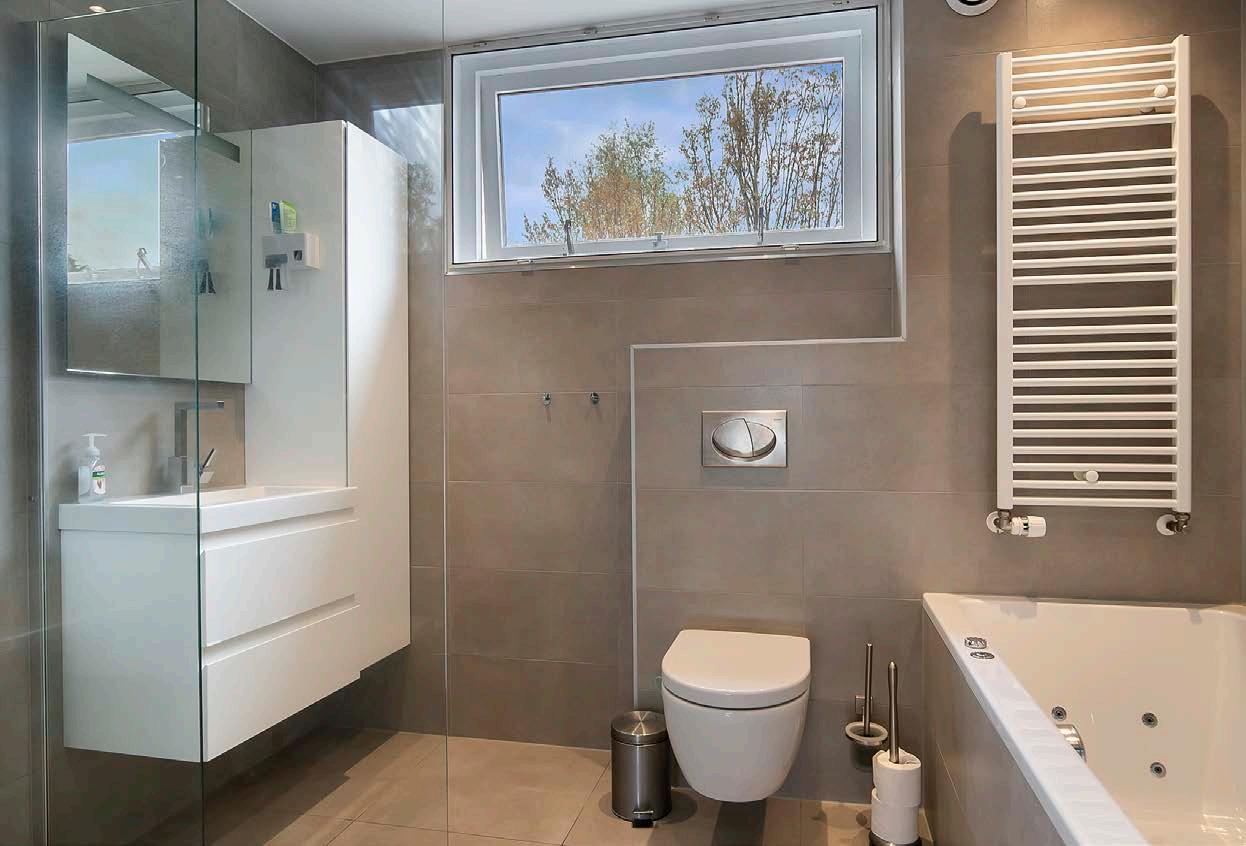 De luxe badkamer is voorzien van een ligbad met bubbelfunctie, douche, wastafelmeubel en een tweede toilet. Ook kun je de ruimte natuurlijk ventileren dankzij het raampje.