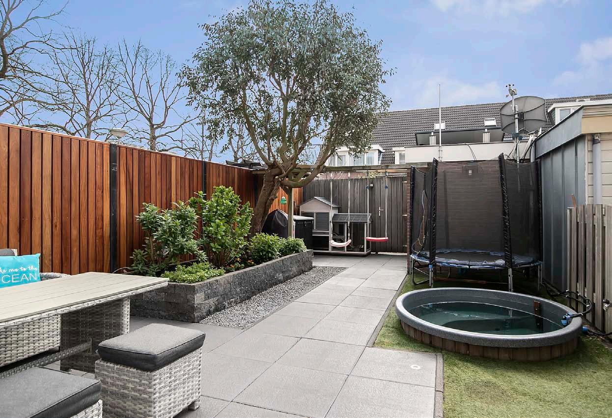 De achtertuin van de woning is op het zuiden gelegen waardoor je de hele dag van de zon kunt genieten. Daarnaast beschikt de achtertuin over een klein zwembad, wat zorgt voor verkoeling tijdens de warme zomerdagen.