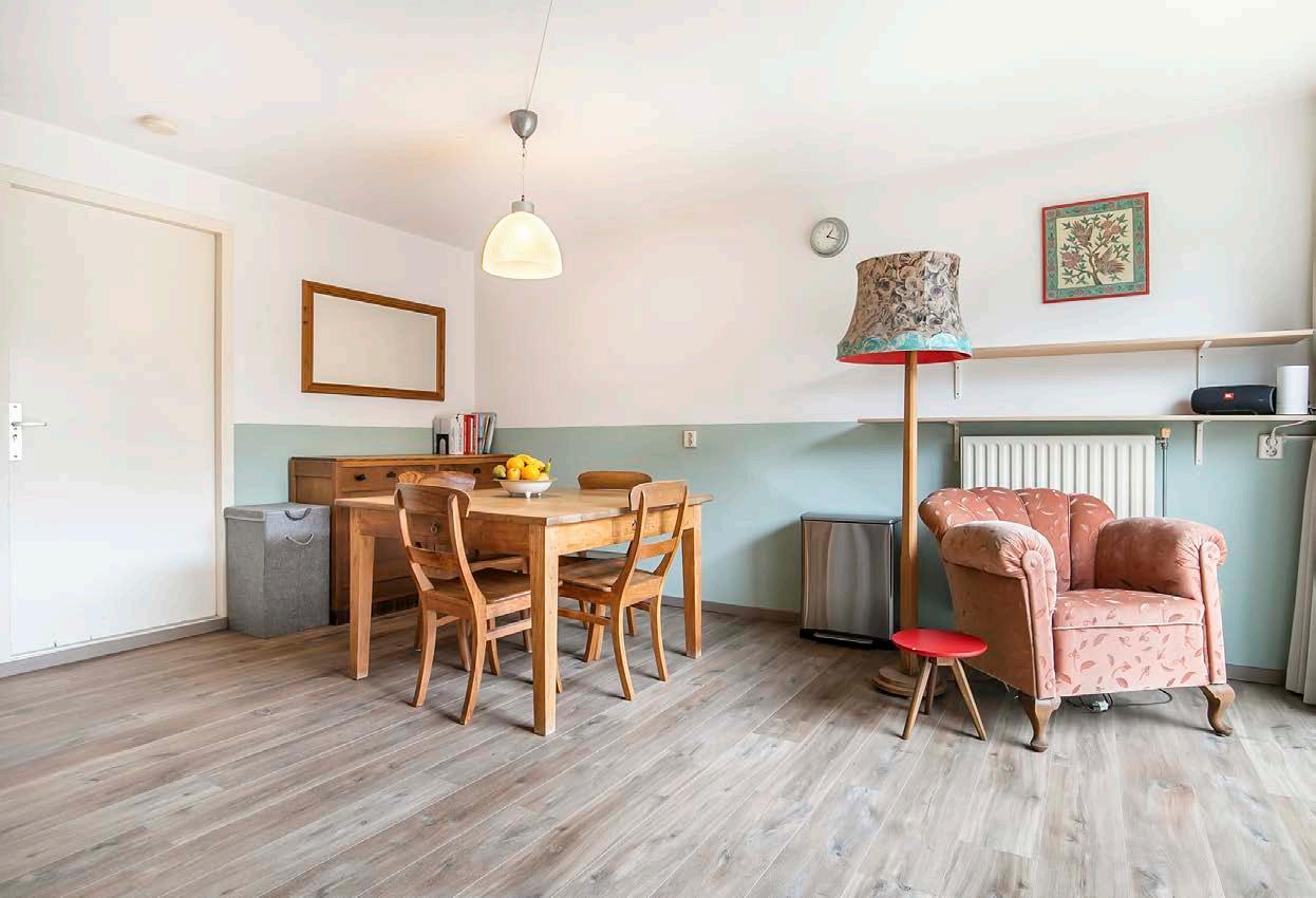 In de eetkamer met L-vormige keuken is plaats voor een grote eettafel en alle ruimte om gezellig te koken en tafelen. De keuken is ingericht met diverse inbouwapparatuur, waaronder een gaskookplaat, afzuigkap en oven. In de kast naast de keuken bevindt zich de aansluiting voor de wasapparatuur. Deze ruimte is afgewerkt met strakke wanden, een laminaatvloer en plinten. Schuif op mooie dagen de glazen pui naar de tuin open en eet lekker buiten.