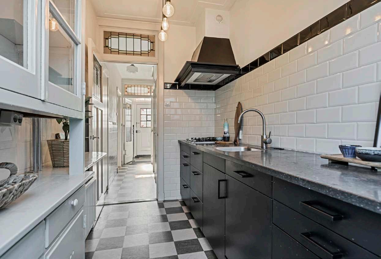 De half open keuken bevindt zich aan de achterzijde van de woning en is voorzien van een 4-pits kookstel, een koel/vries-combinatie, een vaatwasser en een oven. Via de openslaande deuren heb je toegang tot de heerlijke tuin.