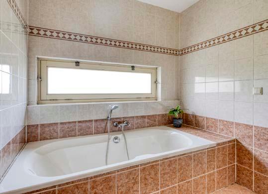 De ruime badkamer heeft een ligbad, doucheruimte en wastafelmeubel. Verder op deze etage een separaat toilet en de technische ruimte met de opstelling van de heteluchtverwarmingWTW-unit en badgeiser.