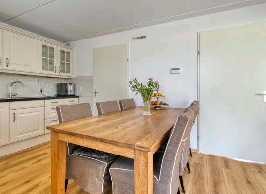 De open woonkeuken is praktisch ingericht, met veel opbergruimte en plek voor een grote eettafel. Aansluitend de bijkeuken met aansluitingen voor wasmachine en droger. Verder ook de doorloop naar de berging/ schuur welke ideaal is voor fietsen etc.