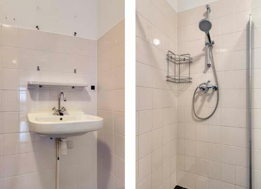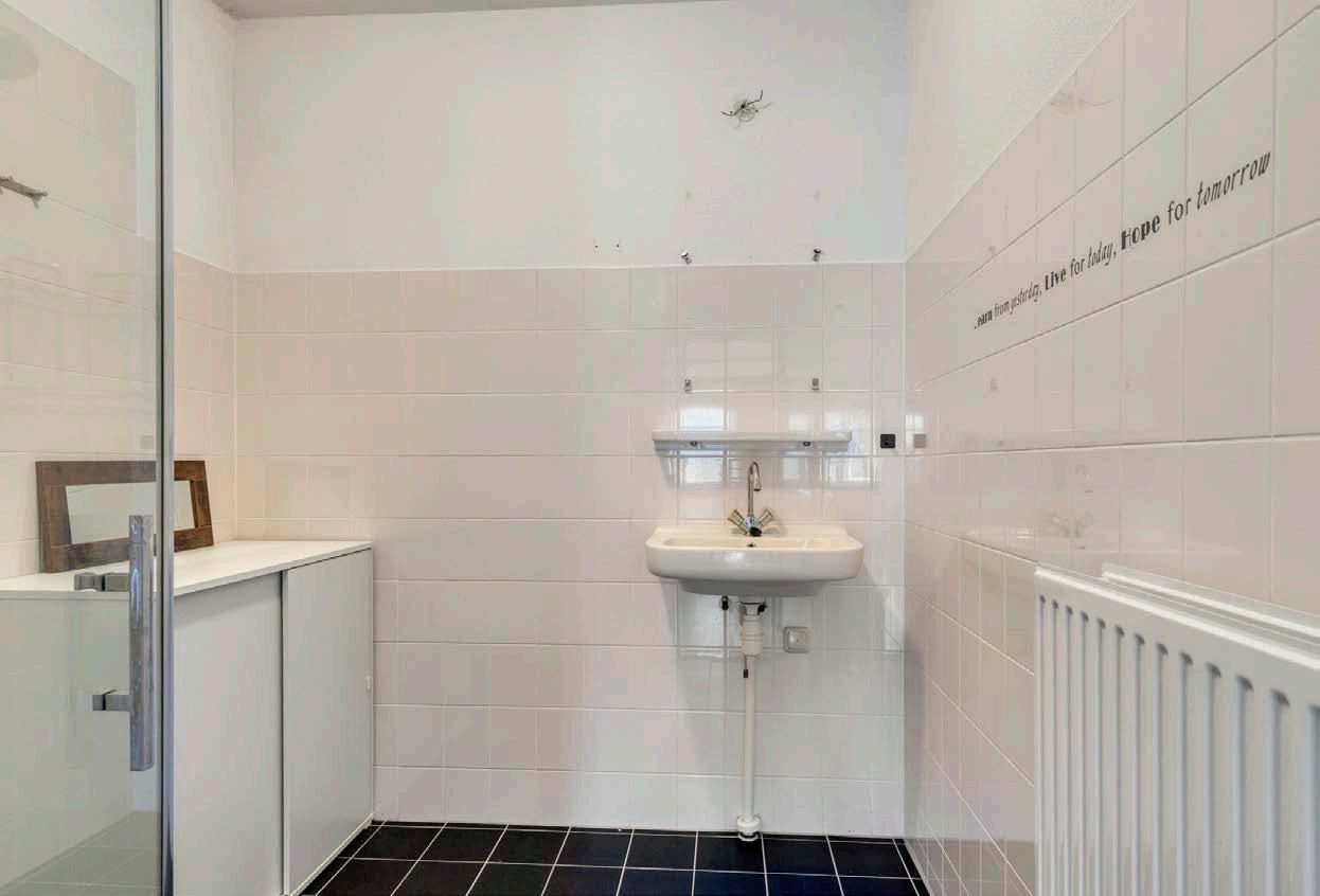 De badkamer is volledig betegeld en praktisch ingedeeld met een douche en wastafelmeubel. Alles strak, verzorgd en direct te gebruiken.