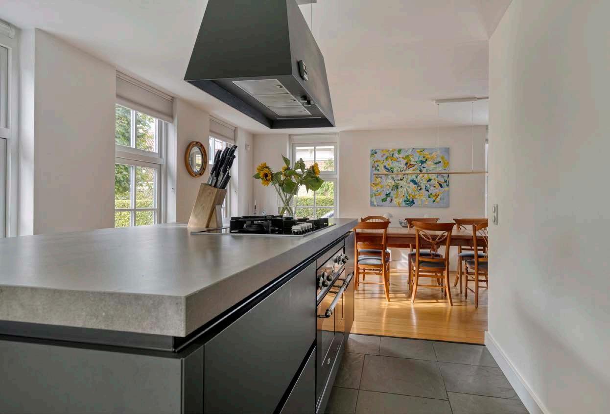 Strakke luxe keuken die uitnodigt om samen te koken met groot kookeiland.