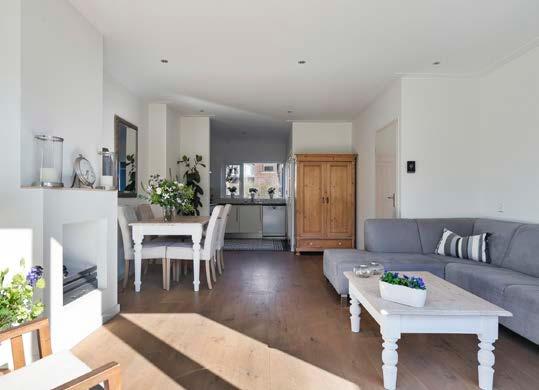 Bij binnenkomst in deze gezinswoning stap je in een ruime hal met een meterkast en toilet. De woonkamer is licht en ruim, voorzien van een houten vloer met vloerverwarming en een gashaard die voor extra sfeer zorgt. Dimbare inbouwspots bieden praktische verlichting. De ruimte is groot genoeg voor een comfortabele zithoek en een eettafel, wat het geschikt maakt voor een gezin.