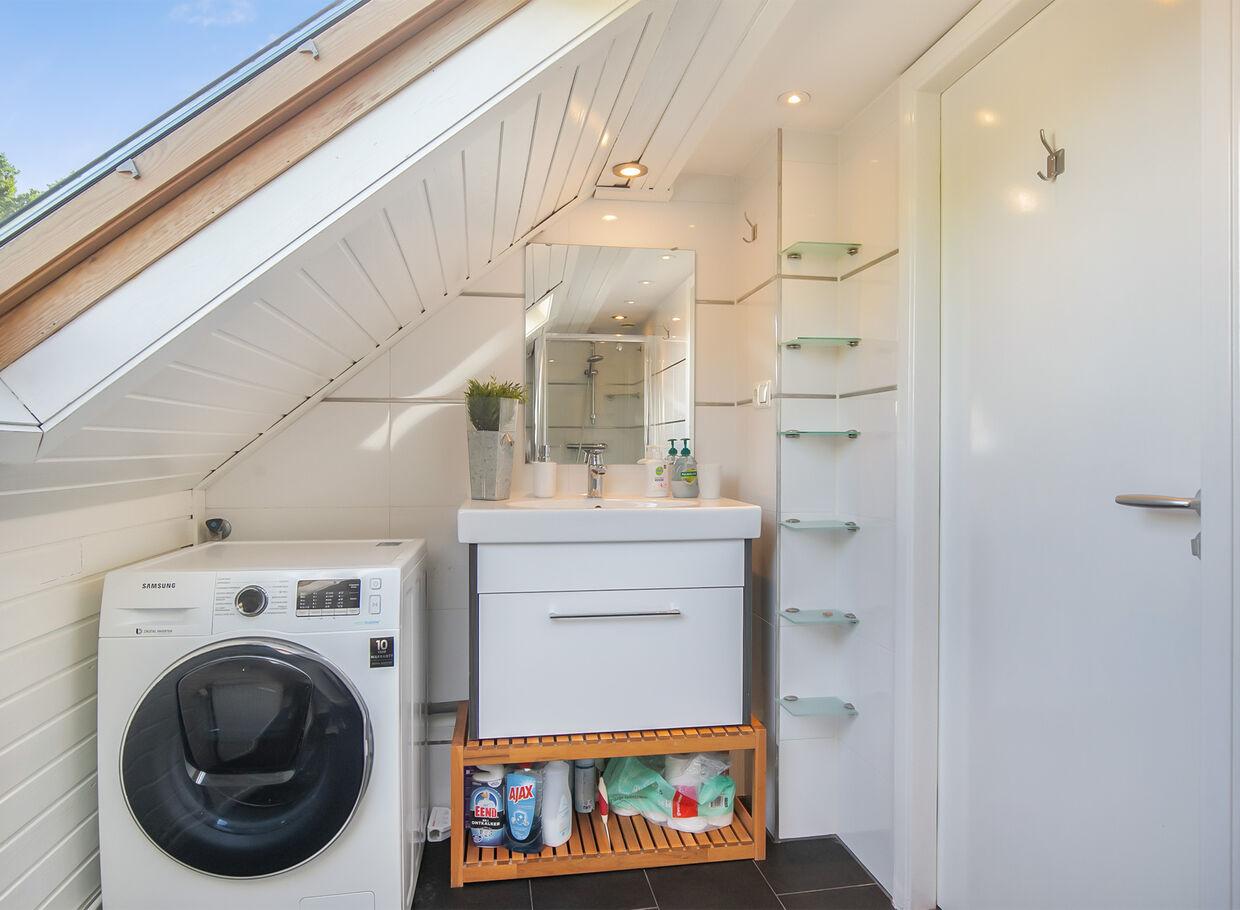De badkamer is netjes en voorzien van alle gemakken. Een verfrissende douche, een praktische wastafel en een tweede toilet (naast het toilet op de begane grond) maken deel uit van deze moderne badkamer. Het tuimelkiepraam geeft veel licht in de badkamer, maar biedt wel privacy.