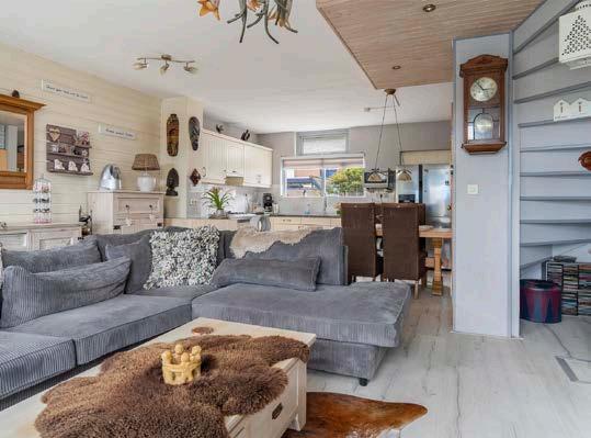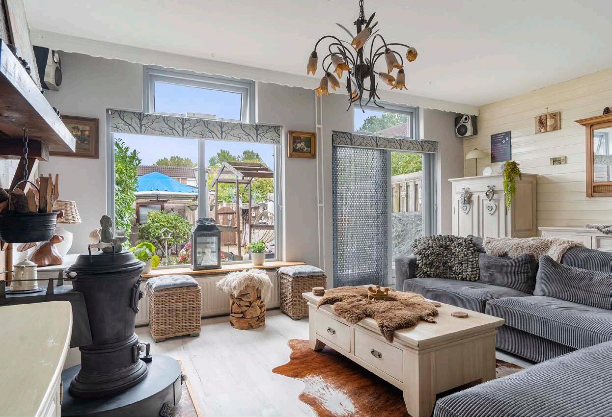 De woonkamer beschikt over een groot raam en openslaande deuren naar de tuin. Zodoende valt het daglicht optimaal naar binnen en ontstaat er een naadloze verbinding met het buitenleven. Het geheel is verzorgd afgewerkt met een laminaatvloer en lichte kleuren op de wanden. Daarnaast zorgt de schouw met potkachel voor extra sfeer en warmte.