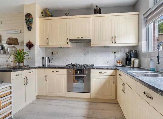 Aan de voorzijde van de woning is de open keuken gevestigd. De keuken is geplaatst in een L-opstelling onder het raam door, waardoor je tijdens het koken een leuk zicht hebt op de voortuin en de straatzijde. Je hebt in de keuken diverse inbouwapparatuur tot je beschikking, zoals een gasfornuis, afzuigkap, oven, vaatwasser en bovendien een boiler voor direct warm water onder het aanrecht.