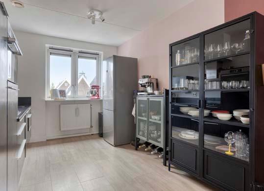 Bij aankomst op de eerste verdieping betreed je het appartement via een nette entree. Vanuit de hal is er toegang tot een modern betegeld toilet en stap je direct de ruime, lichte woonkamer binnen. De grote raampartijen + extra zijraam en openslaande deuren zorgen voor veel natuurlijk licht en verbinden de binnenruimte moeiteloos met het zonnige balkon op het westen
