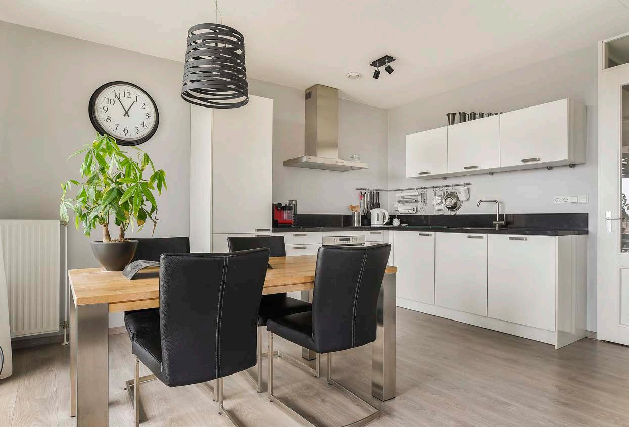 De moderne open keuken sluit naadloos aan op het woongedeelte. Het geheel is geplaatst in een L-opstelling, uitgevoerd in een lichte kleur en afgewerkt met een composiet werkblad. Uiteraard maak je hier straks de lekkerste gerechten klaar met behulp van diverse apparatuur, te noemen een combi oven, koelkast, vriezer, inductiekookplaat, afzuigkap en een vaatwasser.