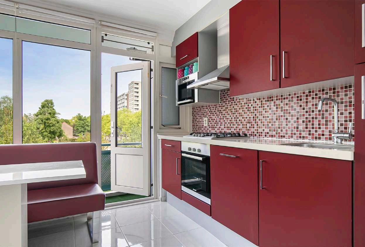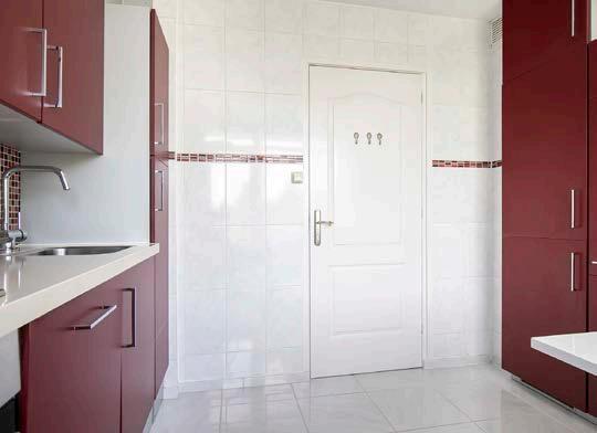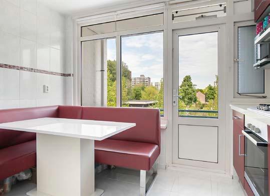 In de dichte keuken kun je in alle rust koken. De keuken is voorzien van mooie (rode) kasten en verschillende inbouwapparaten, zoals een oven en magnetron. Daarnaast is er ook een toegang tot het balkon, waar je heerlijk kunt vertoeven.