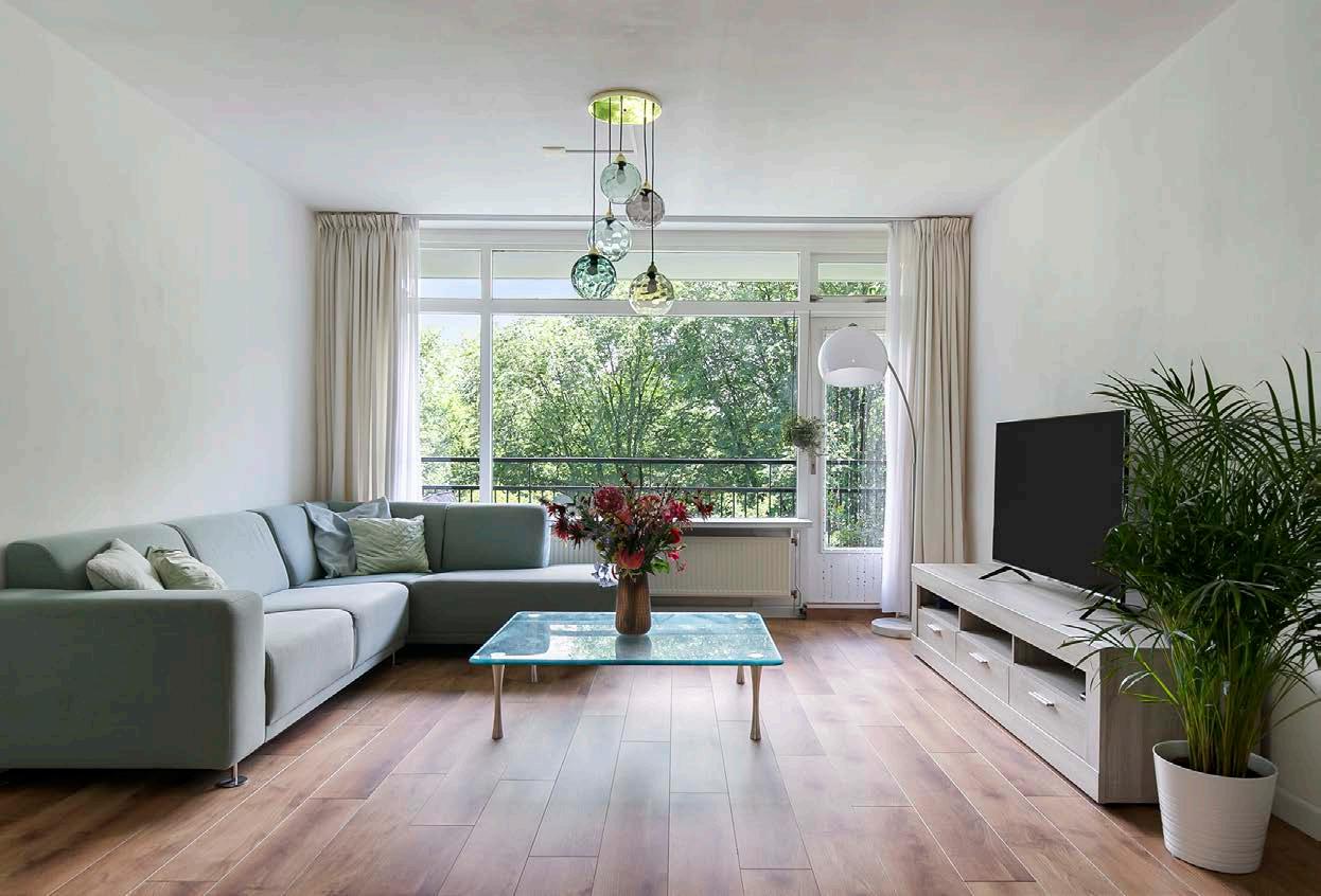 De woonkamer, gelegen aan de achterzijde, heeft toegang tot een balkon waar je kunt genieten van het uitzicht op het groene park.