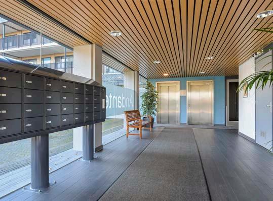 We betreden de keurig verzorgde entree met video foon en postbussen. De centrale hal verleent toe gang tot de afsluitbare, ruime berging en de eigen (buiten) parkeerplaats. Middels de trapopgang of de lift naar boven komen we bij de woning.