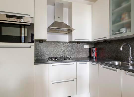 De verzorgde open keuken is ingericht met een praktisch keukenmeubel in L-opstelling met veel werkruimte, veel kastruimte en inbouw-apparatuur, zoals een koel/vriescombinatie, combi oven/mag netron, 4-pits gasfornuis met afzuigkap, vaatwasser en spoelbak. Wat eten we vanavond?