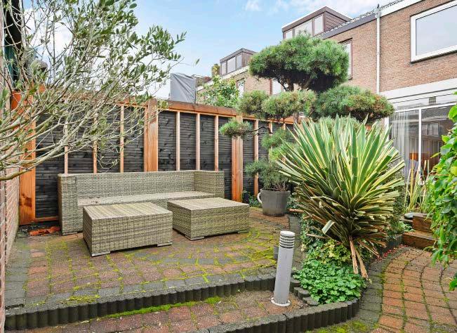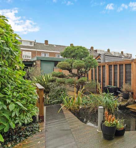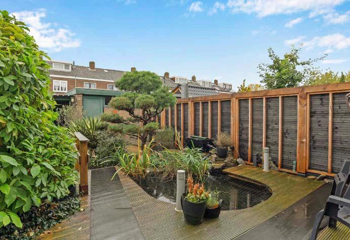 De achtertuin is fraai aangelegd met bestrating, houten vlonders, een vijver en diverse vaste beplan ting. In de tuin vind je verder nog een vrijstaande houten berging en een overkapping. De tuin is tevens ook via een achterom toegankelijk.