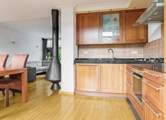 Deze eethoek zal vervolgens aansluiten op de nette open keuken. Hier is een keuken geplaatst in een praktische L-opstelling, waarbij je voldoende kast- en werkruimte tot je beschikking hebt. Daar naast ben je hier voorzien van een gaskookplaat, afzuigkap, oven, vaatwasser, koelkast en een vrie zer (allen van Siemens).