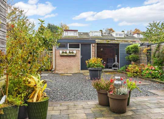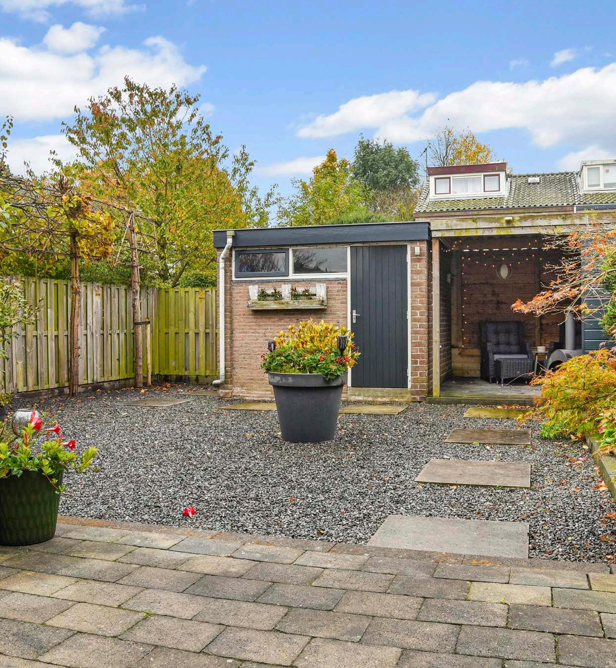 Via de keuken kom je in de achtertuin. De tuin is ge legen op het zuiden en keurig aangelegd. Je vindt een combinatie van bestrating, grind en diverse vaste beplanting.
