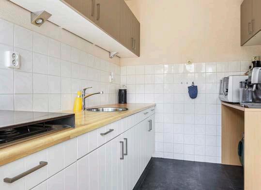 Vanuit het woon- en eetgedeelte loop je zo de open keuken in. Het keukenblok is geplaatst in een wandopstelling en uitgevoerd in een lichte kleur. Dankzij de diverse kasten en lades zul je aan werken opbergruimte niets te kort komen.