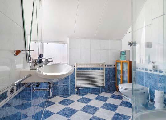 Vervolgens komen we in de badkamer. De ruimte is grotendeels betegeld en oogt daarmee verzorgd. De indeling bestaat uit een douche, wastafel, designradiator en een tweede toilet. Spoel de dag van je af!