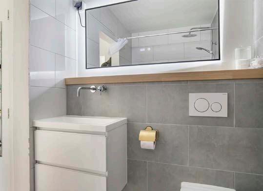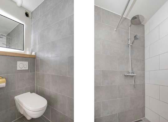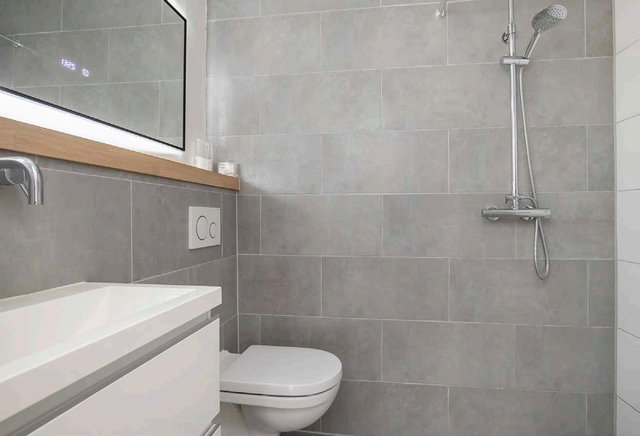 De badkamer is net zo modern en luxe, met een prachtige inloopdouche, een wastafelmeubel met opbergruimte en een wandtoilet. Alles ziet er strak en verzorgd uit, zodat je echt kunt genieten van je eigen kleine oase.