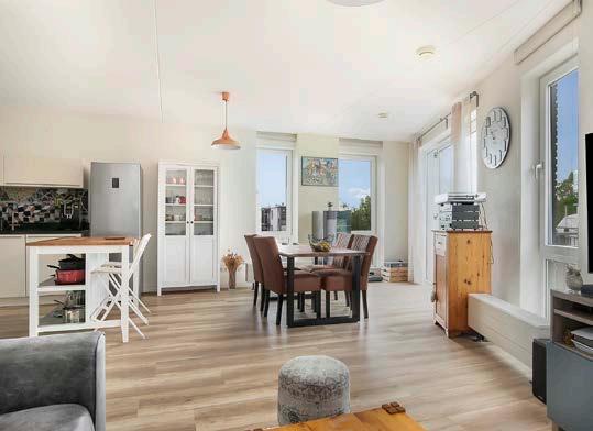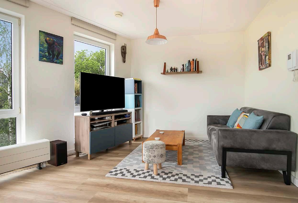 De ruime woonkamer heeft een speelse vorm en is heerlijk licht dankzij de grote ramen en de dubbele deuren naar het zonnige balkon. Je hebt vanuit de woonkamer een leuk uitzicht op de groene omgeving. Er is genoeg ruimte voor een knusse zithoek en een gezellige eethoek waar je eindeloos kunt tafelen. Het geheel is strak afgewerkt met een lichte laminaatvloer en glad gestucte wanden.