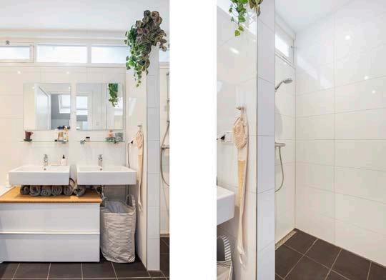 De moderne badkamer is van grond tot aan plafond betegeld en voorzien van een ligbad, inloopdouche en een dubbele wastafel. Het toilet is separaat in de hal gelegen.