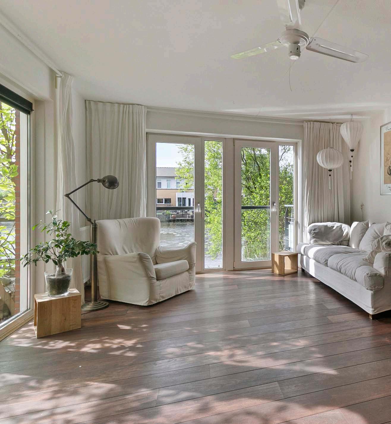 De woonkamer heeft ramen tot aan de vloer, dus vanaf de bank kijken naar waterlelies, eenden, zwanen en soms een ijsvogeltje. Uitbouw woonkamer is mogelijk, fundering is aanwezig.