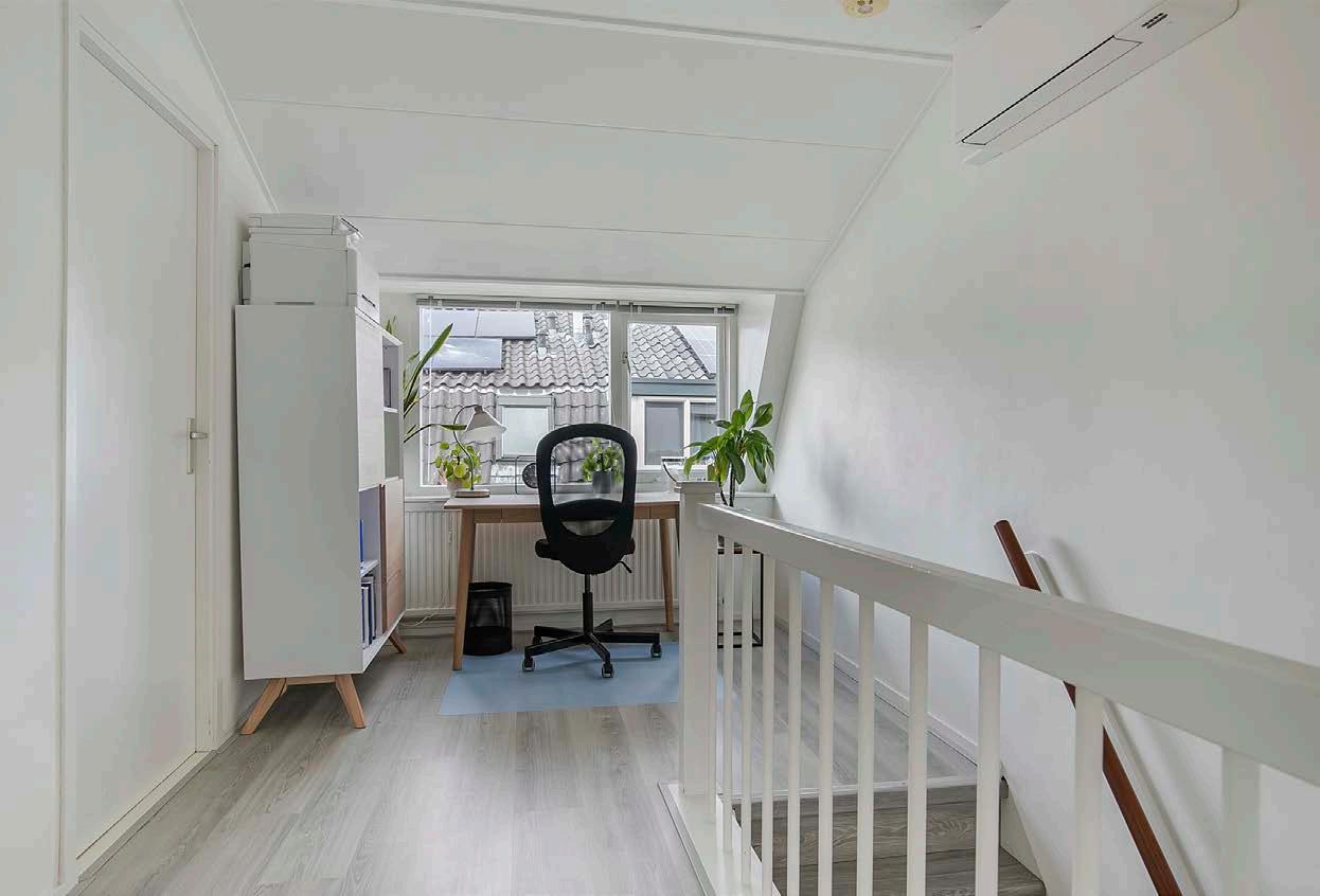 Op de bovenverdieping treffen we een ruime overloop met ruimte voor een handige werkplek. De overloop is voorzien van een in 2023 geïnstalleerde airco, met voldoende capaciteit voor de hele bovenverdieping. De bovenverdieping bevat verder twee slaapkamers en een badkamer. De masterbedroom is ruim en is ingedeeld met ingebouwde kasten. De slaapkamers zijn voorzien van dezelfde lichte houten vloer als beneden. De badkamer op de bovenverdieping is voorzien van een ligbad en wastafelmeubel. Er is een ruime vliering over de hele breedte van de woning voor extra opbergruimte.