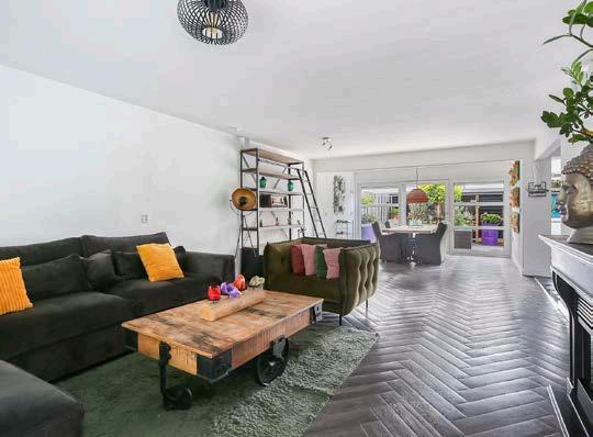 De woonkamer is uitgebouwd over de volledige lengte van de woning en voorzien van een fraaie visgraat pvc-vloer. Het zitgedeelte aan de voorzijde biedt een mooi uitzicht over het aangrenzende veld, dankzij de recentelijk geplaatste hoge kunststof ramen en kozijnen. Het eetgedeelte aan de achterzijde is voorzien van een grote nieuwe kunststof schuifpui, die zorgt voor optimale daglichttoetreding en toegang tot de achtertuin. Daarnaast beschikt de woonkamer over een royale trapkast.