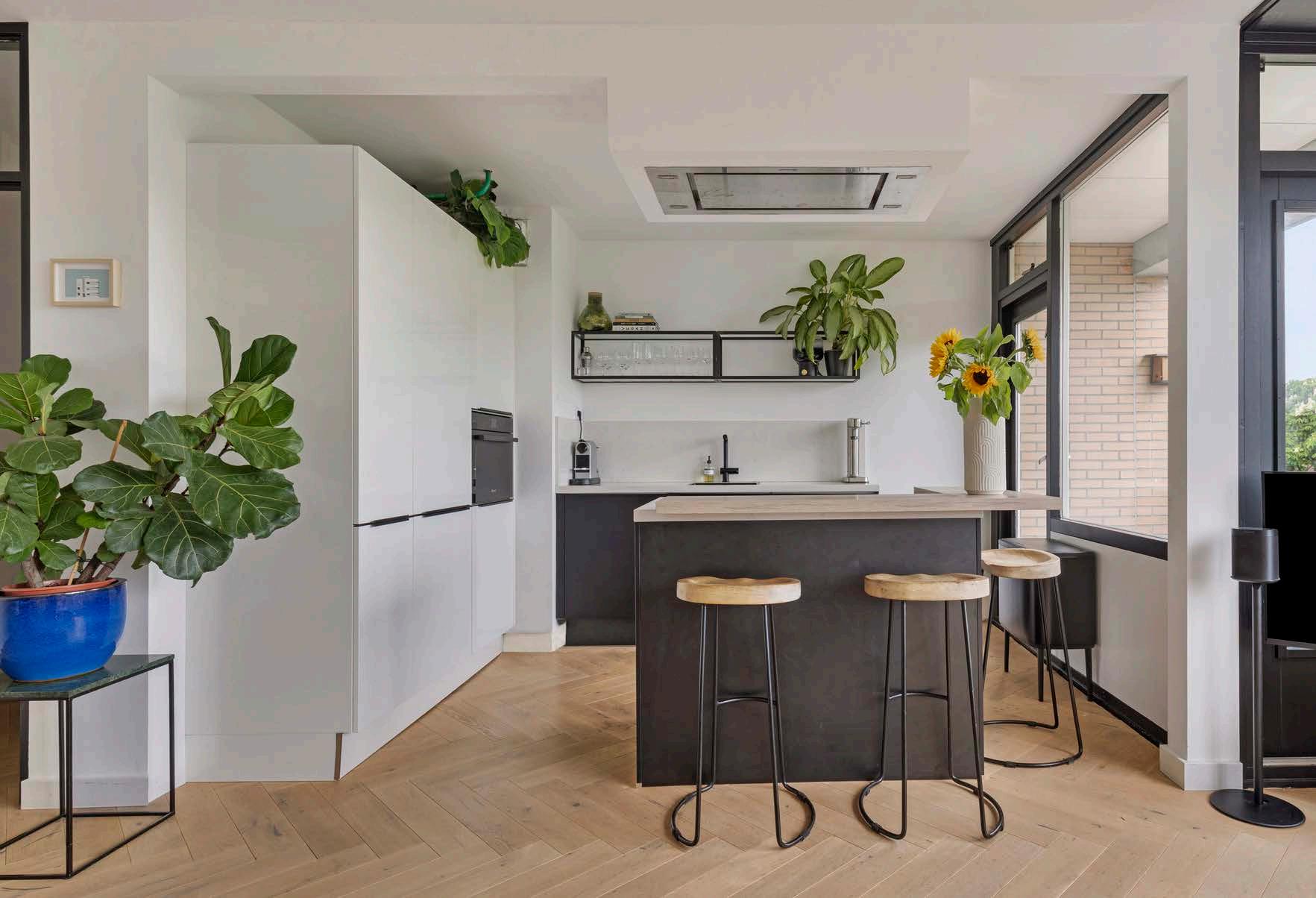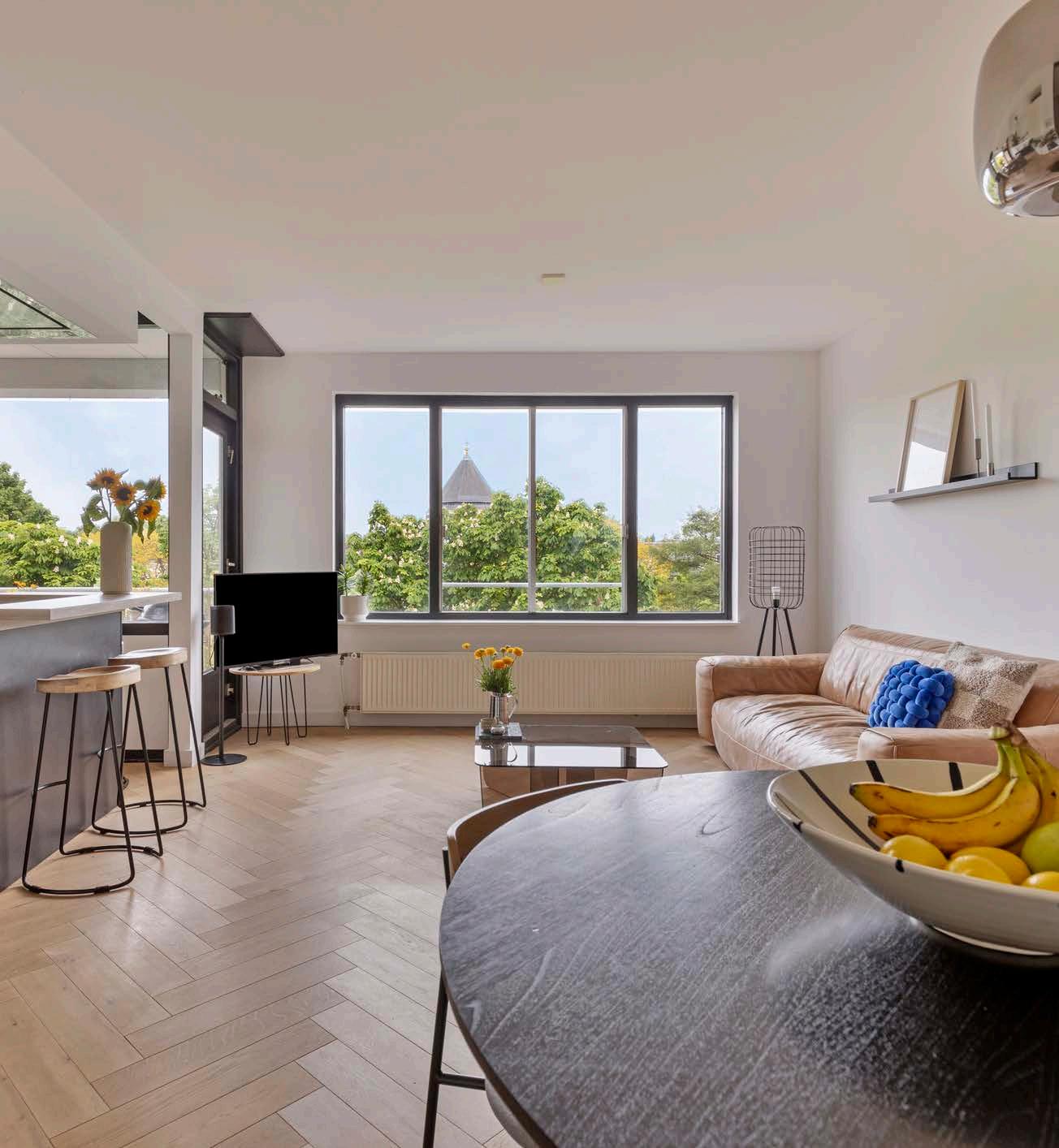 Licht speelt een belangrijke rol in dit appartement op de bovenste verdieping. De vele ramen zorgen ervoor dat het daglicht van twee kanten binnenkomt, wat een open en luchtige sfeer creëert. Het vrije uitzicht over de omringende groengebieden versterkt het gevoel van ruimte en biedt tegelijkertijd een prettige privacy die in de stad soms moeilijk te vinden is.